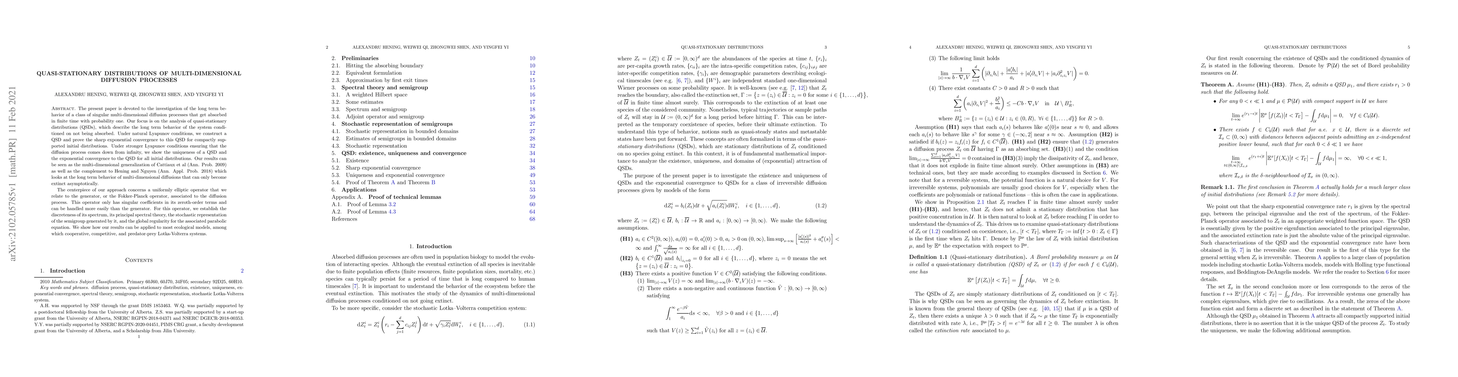 This paper investigates the long-term behavior of singular multi-dimensional diffusion processes, focusing on quasi-stationary distributions (QSDs) under various Lyapunov conditions. The study constructs QSDs and proves exponential convergence, generalizing previous results and complementing other work on extinction behaviors.