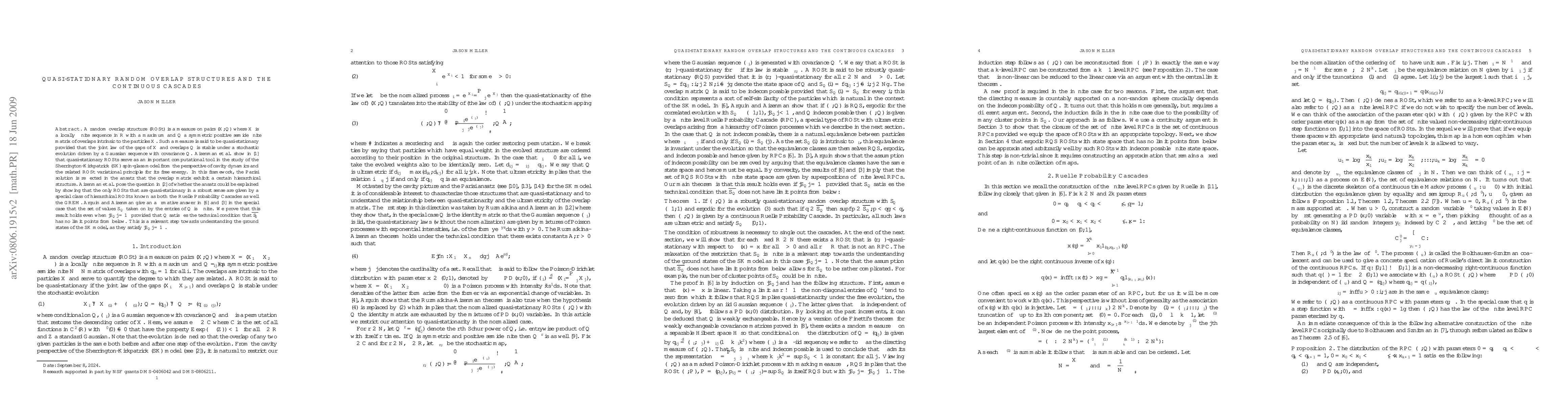A random overlap structure (ROSt) is a measure on pairs (X,Q) where X is a locally finite sequence in the real line with a maximum and Q a positive semidefinite matrix of overlaps intrinsic to the particles X. Such a measure is said to be quasi-stationary provided that the joint law of the gaps of X and overlaps Q is stable under a stochastic evolution driven by a Gaussian sequence with covariance Q. Aizenman et al. have shown that quasi-stationary ROSts serve as an important computational tool in the study of the Sherrington-Kirkpatrick (SK) spin-glass model from the perspective of cavity dynamics and the related ROSt variational principle for its free energy. In this framework, the Parisi solution is reflected in the ansatz that the overlap matrix exhibit a certain hierarchical structure. Aizenman et al. have posed the question of whether the ansatz could be explained by showing that the only ROSts that are quasi-stationary in a robust sense are given by a special class of hierarchical ROSts known as both the Ruelle Probability Cascades as well the GREM. Arguin and Aizenman have given an affirmative answer in the special case that the set of values S_Q taken on by the entries of Q is finite. We prove that this result holds even when |S_Q| is infinite provided that Q satisfies the technical condition that the closure of S_Q has no limit points from below. This is relevant to the understanding of the ground states of the SK model, as they satisfy |S_Q| = infinity.