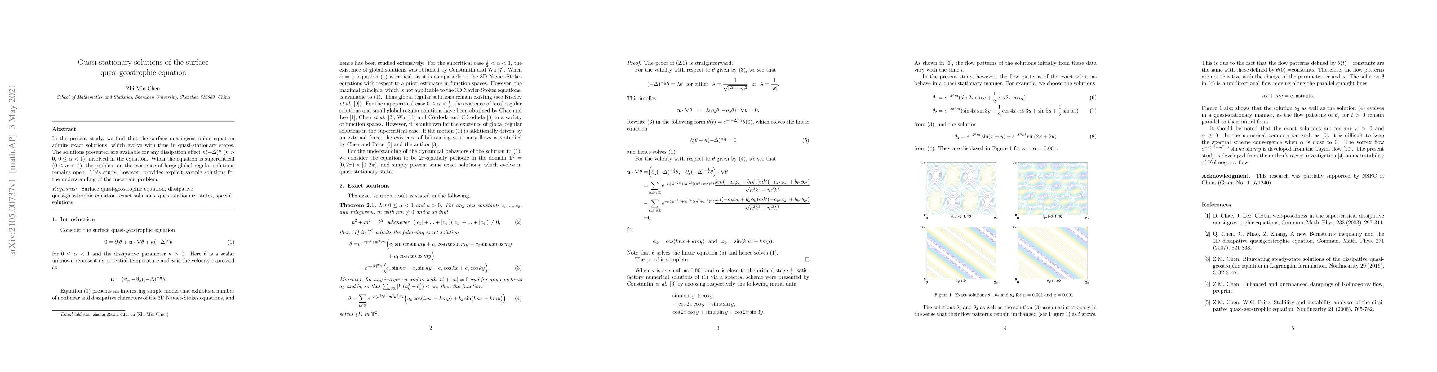 In the present study, we find that the surface quasi-geostrophic equation admits exact solutions, which evolve with time in quasi-stationary states. The solutions presented are available for any dissipation effect $\kappa (-\Delta)^\alpha$ ($\kappa >0$, $0\le \alpha <1$), involved in the equation. When the equation is supercritical ($0\le \alpha <\frac12$), the problem on the existence of large global regular solutions remains open. This study, however, provides explicit sample solutions for the understanding of the uncertain problem.