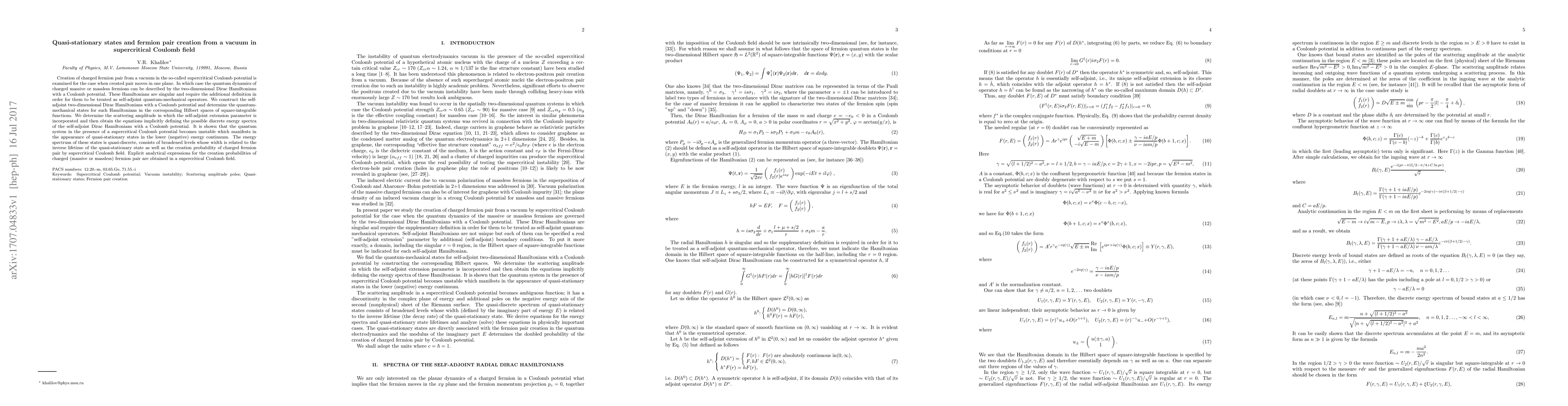 This paper investigates the creation of charged fermion pairs from a vacuum under a supercritical Coulomb potential, constructing self-adjoint two-dimensional Dirac Hamiltonians and determining their quantum states. It reveals the instability of the quantum system, leading to the appearance of quasi-stationary states with broadened energy levels, and provides analytical expressions for the probabilities of charged fermion pair creation.