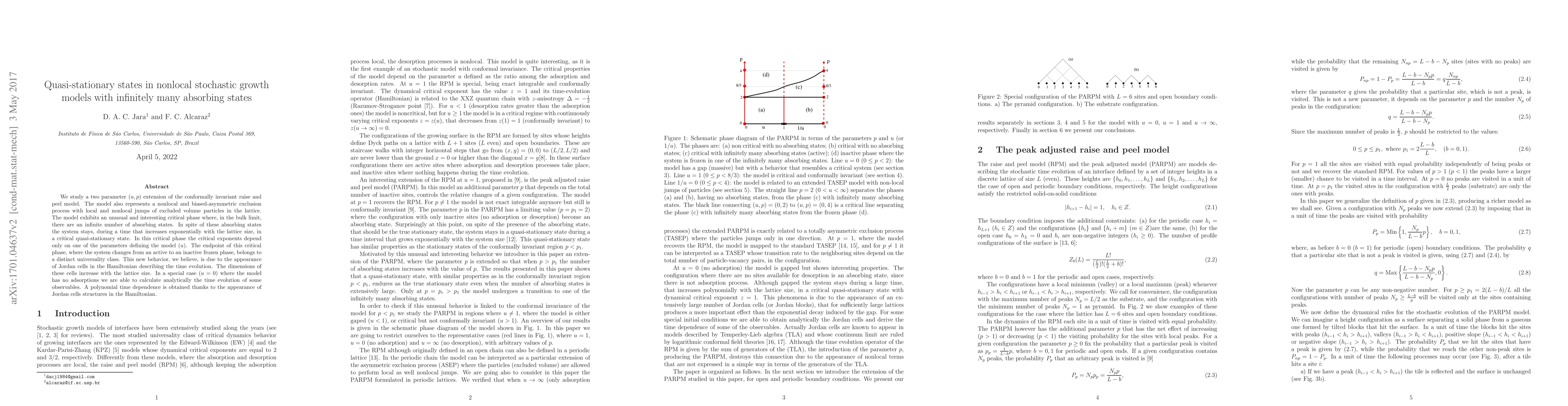 We study a two parameter ($u,p$) extension of the conformally invariant raise and peel model. The model also represents a nonlocal and biased-asymmetric exclusion process with local and nonlocal jumps of excluded volume particles in the lattice. The model exhibits an unusual and interesting critical phase where, in the bulk limit, there are an infinite number of absorbing states. In spite of these absorbing states the system stays, during a time that increases exponentially with the lattice size, in a critical quasi-stationary state. In this critical phase the critical exponents depend only on one of the parameters defining the model ($u$). The endpoint of this critical phase belongs to a distinct universality class, where the system changes from an active to an inactive frozen state. This new behavior we believe to be due to the appearance of Jordan cells in the Hamiltonian describing the time evolution. The dimensions of these cells increases with the lattice size. In a special case ($u=0$) where the model has no adsorptions we are able to calculate analytically the time evolution of some of the observables. A polynomial time dependence is obtained due to the Jordan cells structure of the Hamiltonian.