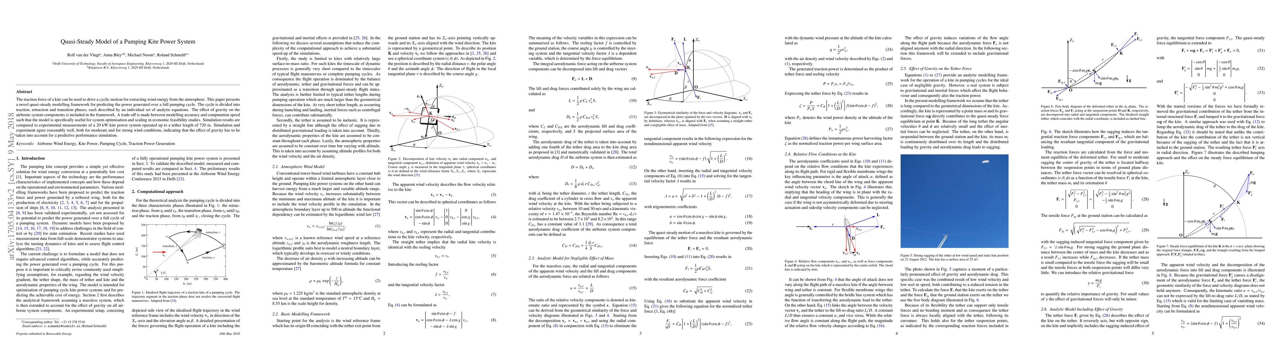 The traction force of a kite can be used to drive a cyclic motion for extracting wind energy from the atmosphere. This paper presents a novel quasi-steady modelling framework for predicting the power generated over a full pumping cycle. The cycle is divided into traction, retraction and transition phases, each described by an individual set of analytic equations. The effect of gravity on the airborne system components is included in the framework. A trade-off is made between modelling accuracy and computation speed such that the model is specifically useful for system optimisation and scaling in economic feasibility studies. Simulation results are compared to experimental measurements of a 20 kW kite power system operated up to a tether length of 720 m. Simulation and experiment agree reasonably well, both for moderate and for strong wind conditions, indicating that the effect of gravity has to be taken into account for a predictive performance simulation.