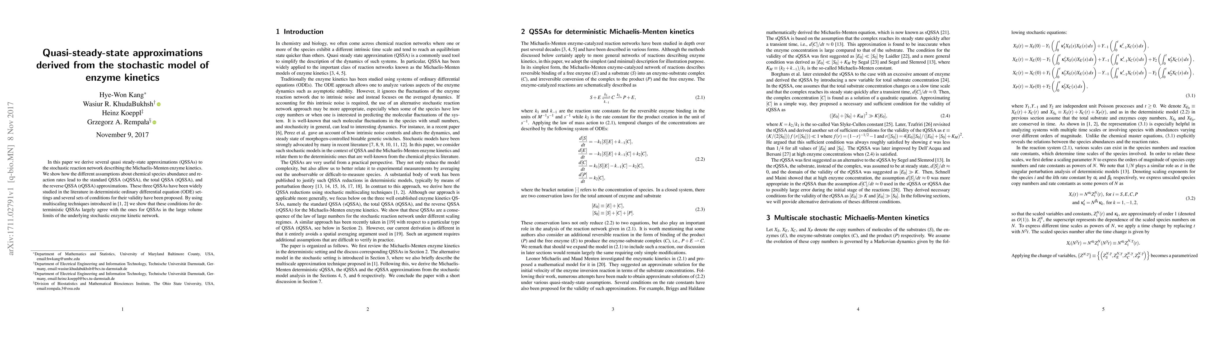 In this paper we derive several quasi steady-state approximations (QSSAs) to the stochastic reaction network describing the Michaelis-Menten enzyme kinetics. We show how the different assumptions about chemical species abundance and reaction rates lead to the standard QSSA (sQSSA), the total QSSA (tQSSA), and the reverse QSSA (rQSSA) approximations. These three QSSAs have been widely studied in the literature in deterministic ordinary differential equation (ODE) settings and several sets of conditions for their validity have been proposed. By using multiscaling techniques introduced in Kang (and Kurtz 2013) and Ball et al. (2006) we show that these conditions for deterministic QSSAs largely agree with the ones for QSSAs in the large volume limits of the underlying stochastic enzyme kinetic network.
