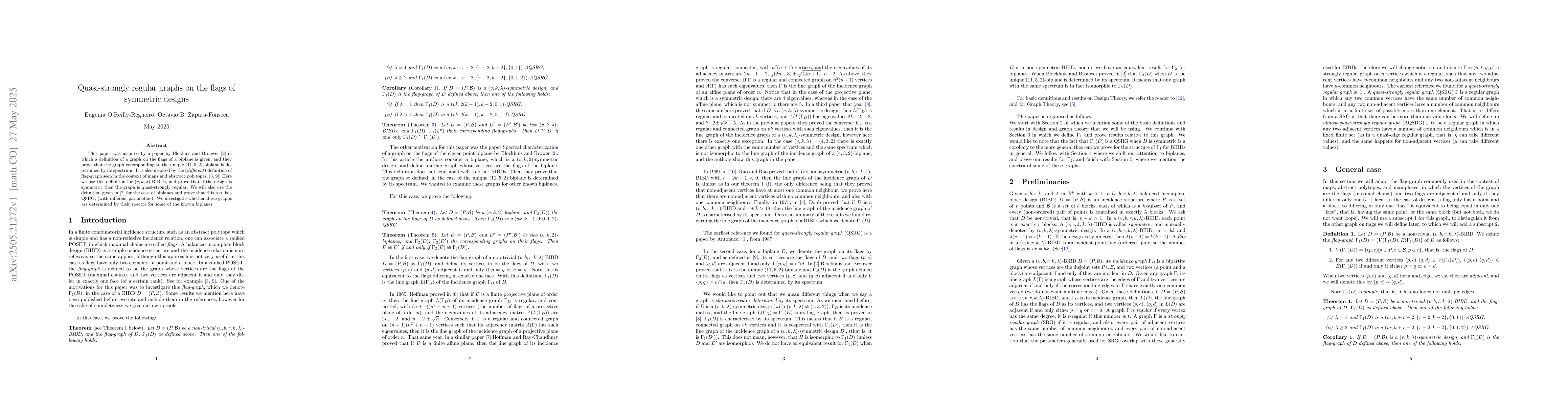 This paper investigates quasi-strongly regular graphs on the flags of symmetric designs, proving that certain graph structures are determined by their spectra.