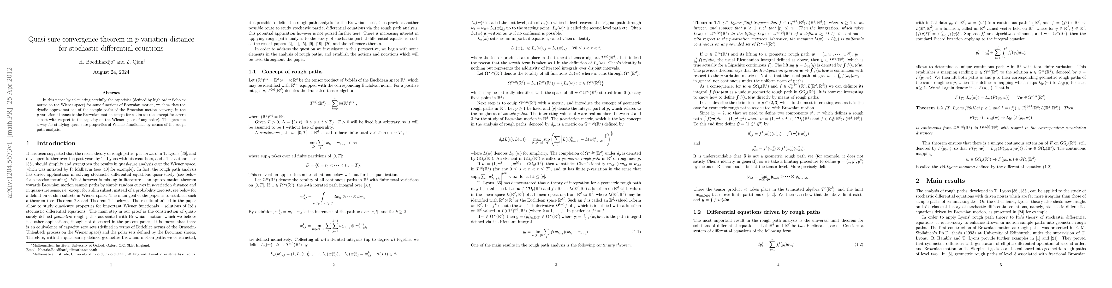 In this paper by calculating carefully the capacities (defined by high order Sobolev norms on the Wiener space) for some functions of Brownian motion, we show that the dyadic approximations of the sample paths of the Brownian motion converge in the $p$-variation distance to the Brownian motion except for a slim set (i.e. except for a zero subset with respect to the capacity on the Wiener space of any order). This presents a way for studying quasi-sure properties of Wiener functionals by means of the rough path analysis.
