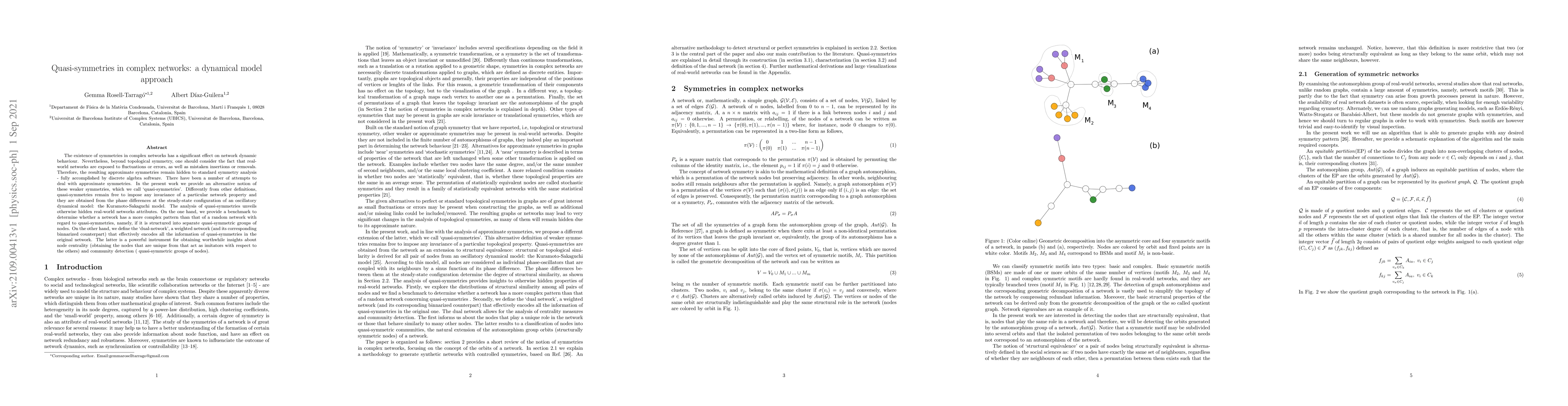 The existence of symmetries in complex networks has a significant effect on network dynamic behaviour. Nevertheless, beyond topological symmetry, one should consider the fact that real-world networks are exposed to fluctuations or errors, as well as mistaken insertions or removals. Therefore, the resulting approximate symmetries remain hidden to standard symmetry analysis - fully accomplished by discrete algebra software. There have been a number of attempts to deal with approximate symmetries. In the present work we provide an alternative notion of these weaker symmetries, which we call `quasi-symmetries'. Differently from other definitions, quasi-symmetries remain free to impose any invariance of a particular network property and they are obtained from the phase differences at the steady-state configuration of an oscillatory dynamical model: the Kuramoto-Sakaguchi model. The analysis of quasi-symmetries unveils otherwise hidden real-world networks attributes. On the one hand, we provide a benchmark to determine whether a network has a more complex pattern than that of a random network with regard to quasi-symmetries, namely, if it is structured into separate quasi-symmetric groups of nodes. On the other hand, we define the `dual-network', a weighted network (and its corresponding binnarized counterpart) that effectively encodes all the information of quasi-symmetries in the original network. The latter is a powerful instrument for obtaining worthwhile insights about node centrality (obtaining the nodes that are unique from that act as imitators with respect to the others) and community detection ( quasi-symmetric groups of nodes).