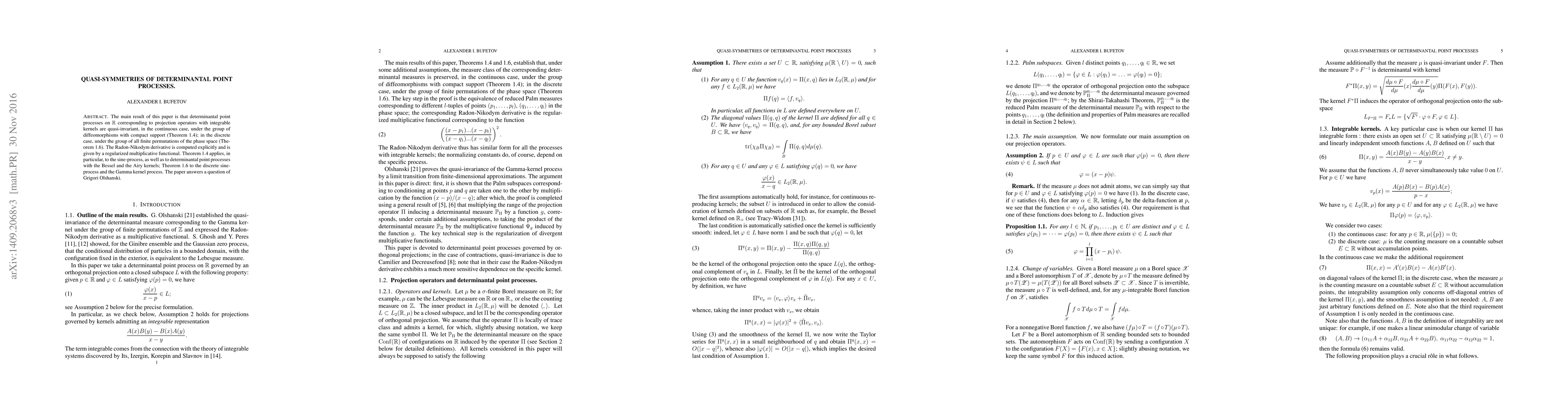 The main result of this paper is that determinantal point processes on the real line corresponding to projection operators with integrable kernels are quasi-invariant, in the continuous case, under the group of diffeomorphisms with compact support (Theorem 1.4); in the discrete case, under the group of all finite permutations of the phase space (Theorem 1.6). The Radon-Nikodym derivative is computed explicitly and is given by a regularized multiplicative functional. Theorem 1.4 applies, in particular, to the sine-process, as well as to determinantal point processes with the Bessel and the Airy kernels; Theorem 1.6 to the discrete sine-process and the Gamma kernel process. The paper answers a question of Grigori Olshanski.