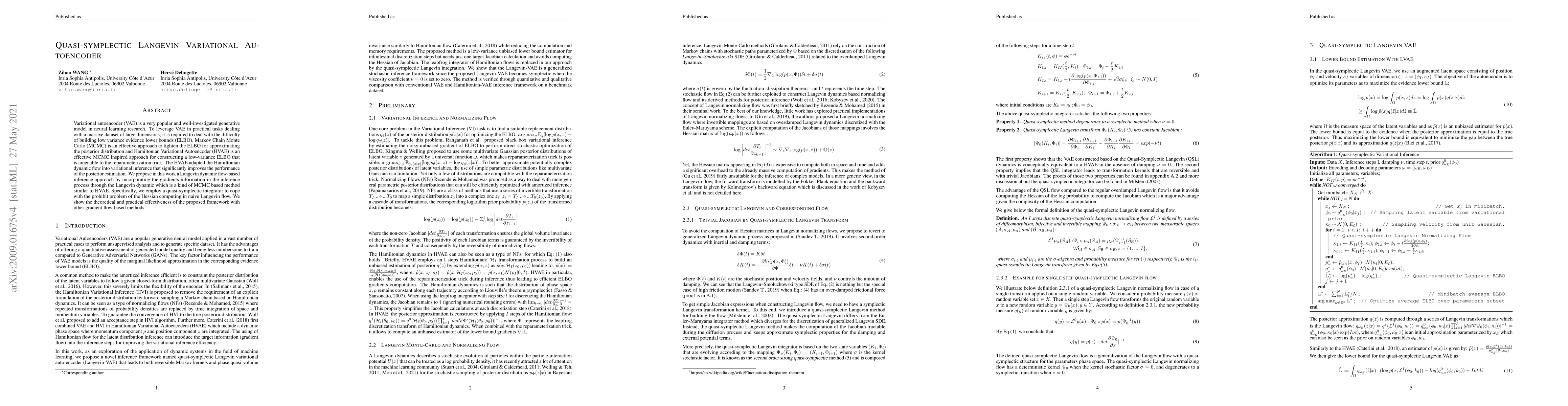 The paper proposes a Quasi-symplectic Langevin Variational Autoencoder (QLVAE) to improve the efficiency of variational autoencoders for large datasets by using a quasi-symplectic integrator in the Langevin dynamics to avoid Hessian computation issues. The approach demonstrates both theoretical and practical effectiveness compared to other gradient flow-based methods.