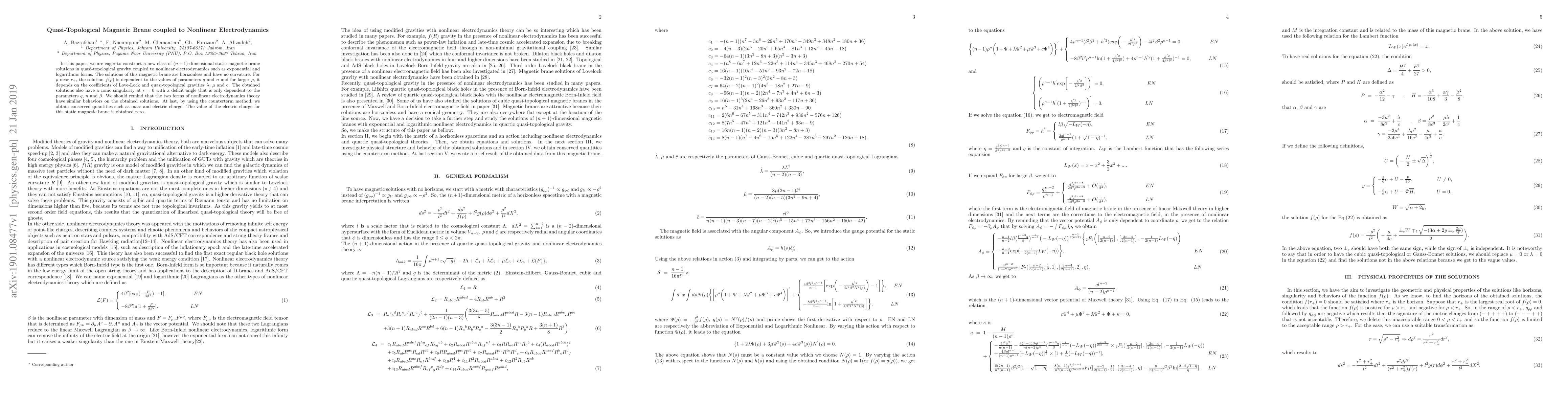 This paper explores the construction of static magnetic brane solutions in quasi-topological gravity coupled with nonlinear electrodynamics, revealing horizonless and curvature-free solutions with a conic singularity. The mass and electric charge are calculated using the counterterm method, with the electric charge found to be zero.