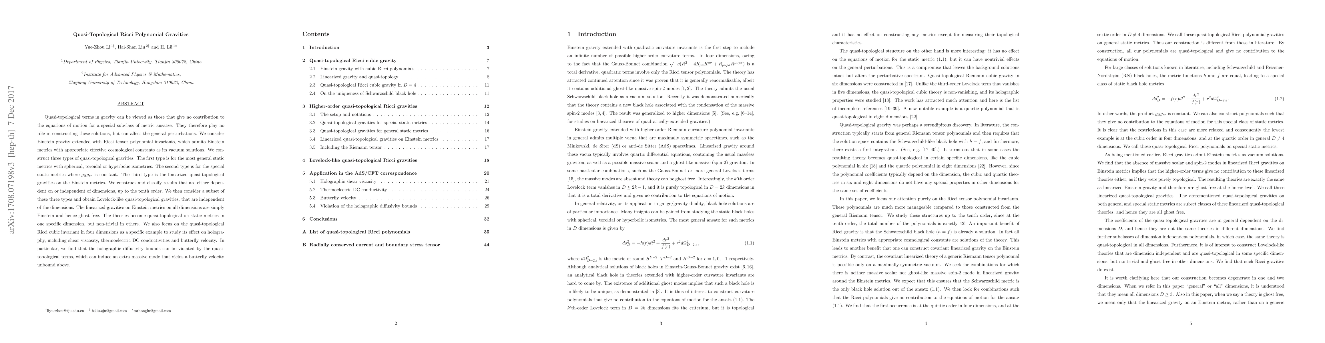 Quasi-topological terms in gravity can be viewed as those that give no contribution to the equations of motion for a special subclass of metric ans\"atze. They therefore play no r\^ole in constructing these solutions, but can affect the general perturbations. We consider Einstein gravity extended with Ricci tensor polynomial invariants, which admits Einstein metrics with appropriate effective cosmological constants as its vacuum solutions. We construct three types of quasi-topological gravities. The first type is for the most general static metrics with spherical, toroidal or hyperbolic isometries. The second type is for the special static metrics where $g_{tt} g_{rr}$ is constant. The third type is the linearized quasi-topological gravities on the Einstein metrics. We construct and classify results that are either dependent on or independent of dimensions, up to the tenth order. We then consider a subset of these three types and obtain Lovelock-like quasi-topological gravities, that are independent of the dimensions. The linearized gravities on Einstein metrics on all dimensions are simply Einstein and hence ghost free. The theories become quasi-topological on static metrics in one specific dimension, but non-trivial in others. We also focus on the quasi-topological Ricci cubic invariant in four dimensions as a specific example to study its effect on holography, including shear viscosity, thermoelectric DC conductivities and butterfly velocity. In particular, we find that the holographic diffusivity bounds can be violated by the quasi-topological terms, which can induce an extra massive mode that yields a butterfly velocity unbound above.