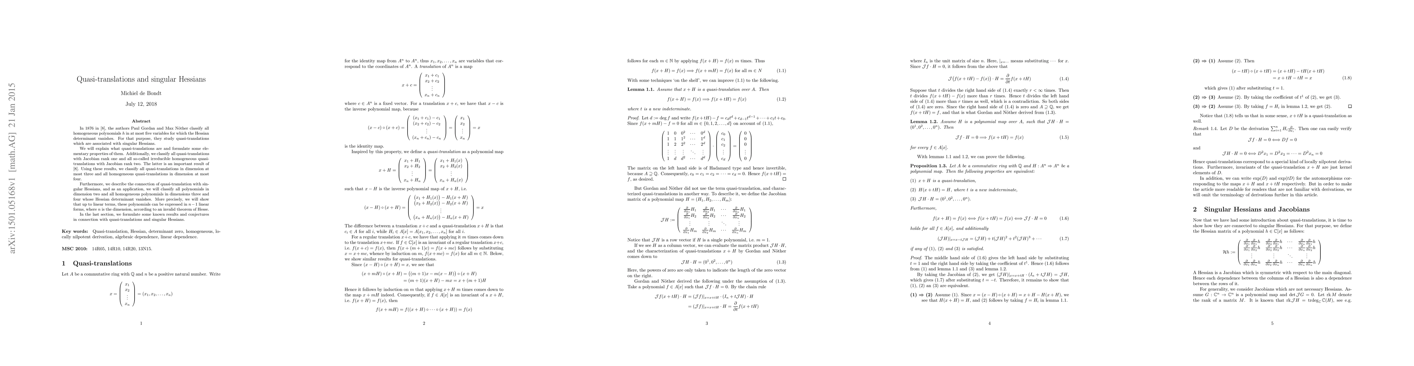 In 1876 in [8], the authors Paul Gordan and Max N\"other classify all homogeneous polynomials h in at most five variables for which the Hessian determinant vanishes. For that purpose, they study quasi-translations which are associated with singular Hessians. We will explain what quasi-translations are and formulate some elementary properties of them. Additionally, we classify all quasi-translations with Jacobian rank one and all so-called irreducible homogeneous quasi-translations with Jacobian rank two. The latter is an important result of [8]. Using these results, we classify all quasi-translations in dimension at most three and all homogeneous quasi-translations in dimension at most four. Furthermore, we describe the connection of quasi-translation with singular Hessians, and as an application, we will classify all polynomials in dimension two and all homogeneous polynomials in dimensions three and four whose Hessian determinant vanishes. More precisely, we will show that up to linear terms, these polynomials can be expressed in n-1 linear forms, where n is the dimension, according to an invalid theorem of Hesse. In the last section, we formulate some known results and conjectures in connection with quasi-translations and singular Hessians.