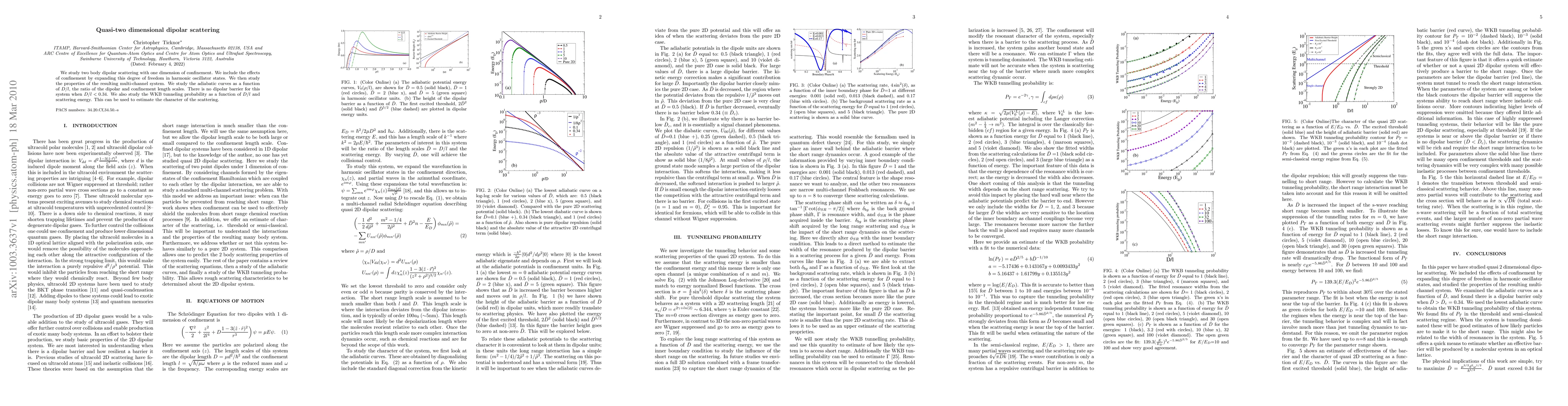 This paper investigates quasi-two-dimensional dipolar scattering with one confinement dimension, analyzing the resulting multi-channel system and adiabatic curves. It finds no dipolar barrier when the ratio of dipolar to confinement length scales is below 0.34, and examines the WKB tunneling probability for scattering characterization.