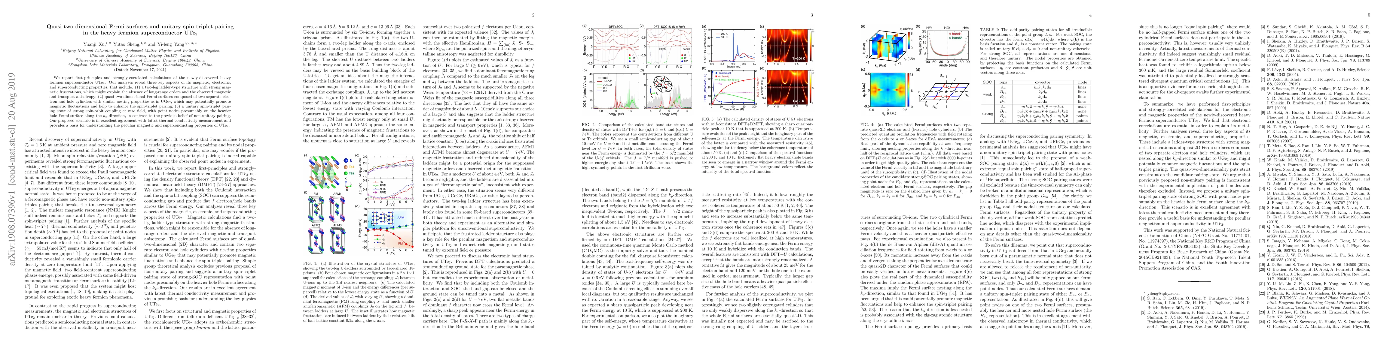 We report first-principles and strongly-correlated calculations of the newly-discovered heavy fermion superconductor UTe$_2$. Our analyses reveal three key aspects of its magnetic, electronic, and superconducting properties, that include: (1) a two-leg ladder-type structure with strong magnetic frustrations, which might explain the absence of long-range orders and the observed magnetic and transport anisotropy; (2) quasi-two-dimensional Fermi surfaces composed of two separate electron and hole cylinders with similar nesting properties as in UGe$_2$, which may potentially promote magnetic fluctuations and help to enhance the spin-triplet pairing; (3) a unitary spin-triplet pairing state of strong spin-orbit coupling at zero field, with point nodes presumably on the heavier hole Fermi surface along the $k_x$-direction, in contrast to the previous belief of non-unitary pairing. Our proposed scenario is in excellent agreement with latest thermal conductivity measurement and provides a basis for understanding the peculiar magnetic and superconducting properties of UTe$_2$.