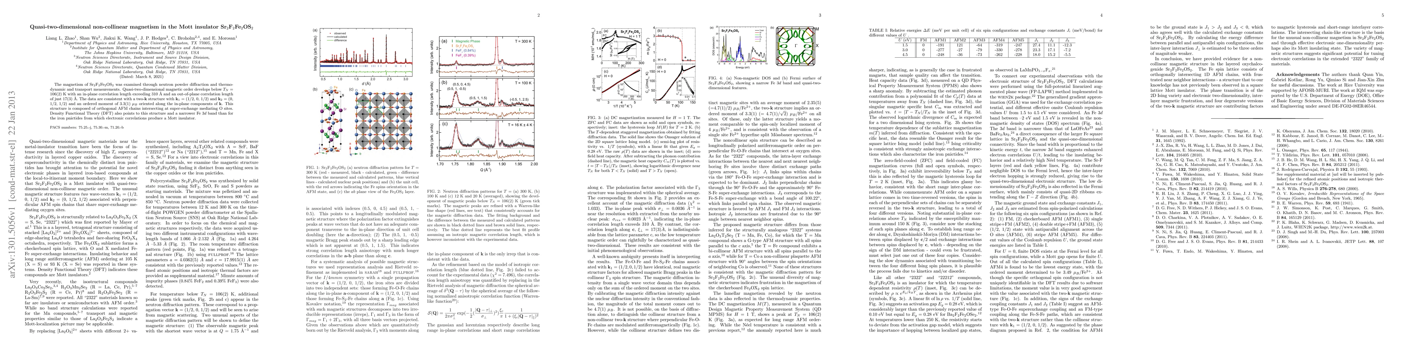 Researchers studied Sr$_2$F$_2$Fe$_2$OS$_2$, finding quasi-two-dimensional magnetism with a unique, non-collinear structure that emerges below 106 K.