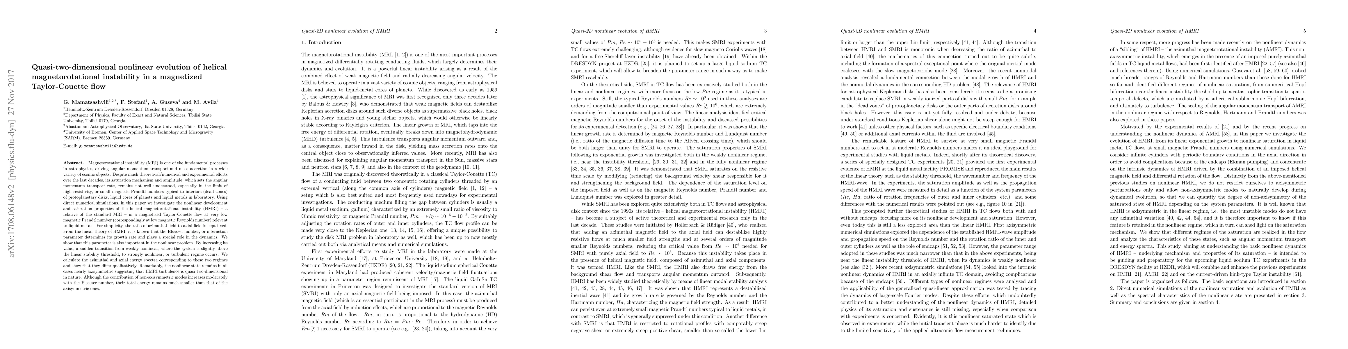 This paper investigates the quasi-two-dimensional nonlinear evolution of helical magnetorotational instability (HMRI) in a magnetized Taylor-Couette flow, focusing on its saturation mechanism and energy spectra. The study reveals a transition from weakly to strongly nonlinear regimes with increasing Elsasser number, showing that HMRI turbulence remains predominantly axisymmetric and quasi two-dimensional.