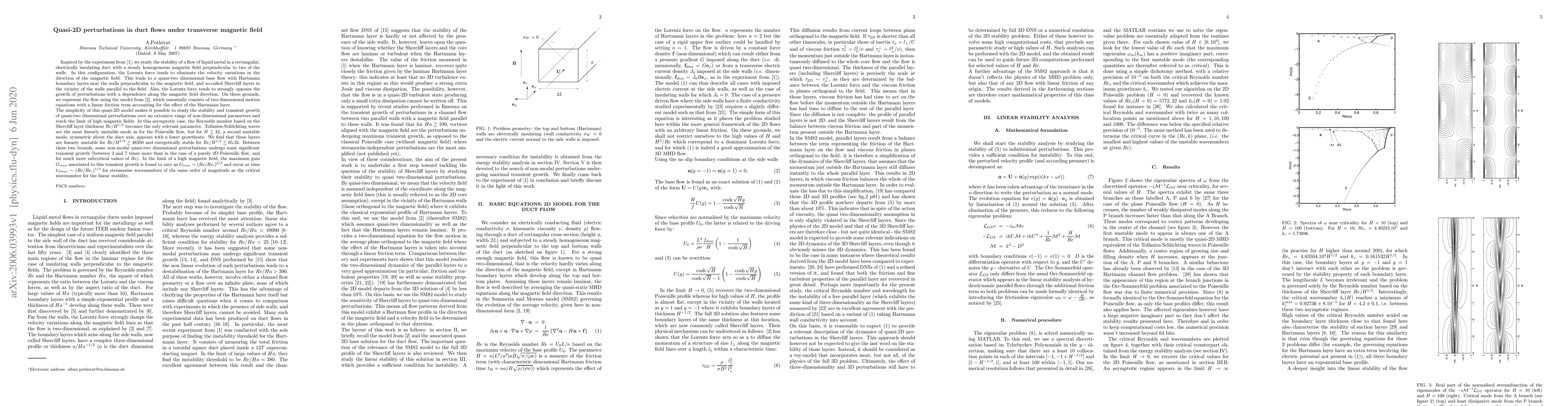 This paper investigates the stability of liquid metal flow in a duct under a transverse magnetic field, revealing quasi-two-dimensional perturbations. It finds that non-modal perturbations can grow transiently up to 7 times more than in purely 2D flows, with significant growth occurring for subcritical Reynolds numbers.
