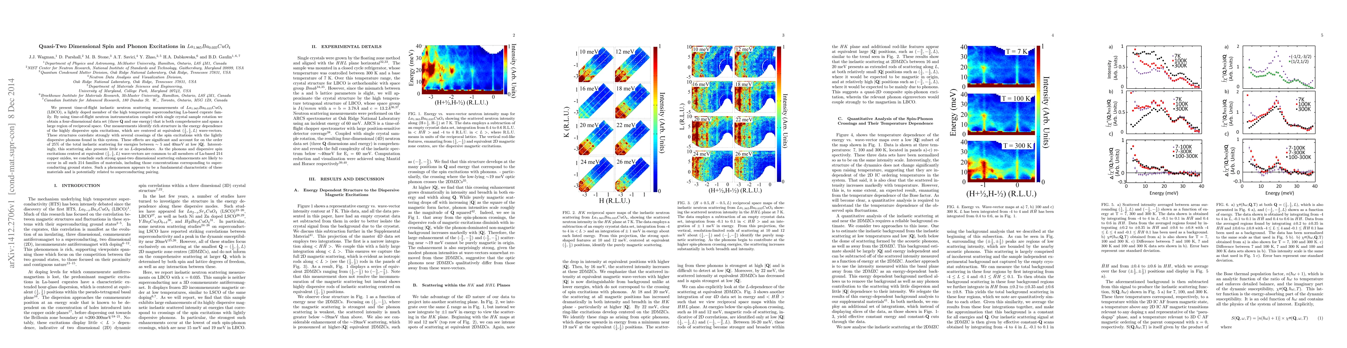We present time-of-flight inelastic neutron scattering measurements of $La_{1.965}Ba_{0.035}CuO_{4}$ (LBCO), a lightly doped member of the high temperature superconducting La-based cuprate family. By using time-of-flight neutron instrumentation coupled with single crystal sample rotation we obtain a four-dimensional data set (three {\bf Q} and one energy) that is both comprehensive and spans a large region of reciprocal space. Our measurements identify rich structure in the energy dependence of the highly dispersive spin excitations, which are centered at equivalent ($\frac{1}{2},\frac{1}{2}, L$) wave-vectors. These structures correlate strongly with several crossings of the spin excitations with the lightly dispersive phonons found in this system. These effects are significant and account for on the order of 25$\%$ of the total inelastic scattering for energies between $\sim$5 and 40 meV at low $|{\bf Q}|$. Interestingly, this scattering also presents little or no $L$-dependence. As the phonons and dispersive spin excitations centered at equivalent ($\frac{1}{2},\frac{1}{2}, L$) wave-vectors are common to all members of La-based 214 copper oxides, we conclude such strong quasi-two dimensional scattering enhancements are likely to occur in all such 214 families of materials, including those concentrations corresponding to superconducting ground states. Such a phenomenon appears to be a fundamental characteristic of these materials and is potentially related to superconducting pairing.