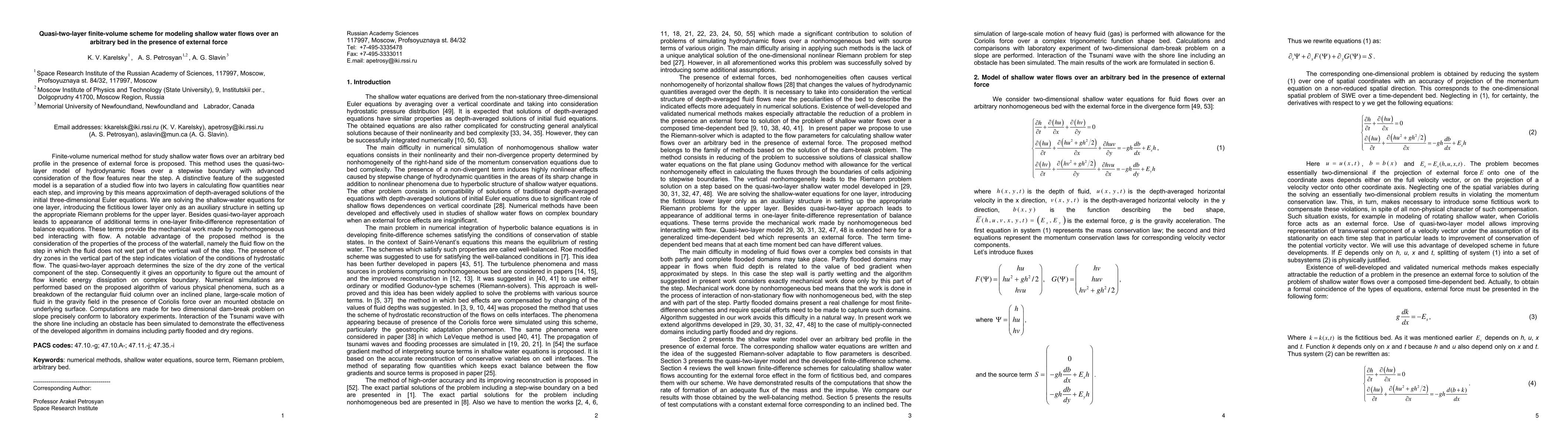 This paper proposes a quasi-two-layer finite-volume scheme for modeling shallow water flows with external forces, using a stepwise boundary approach. It separates flow into two layers to better approximate depth-averaged solutions and considers dry zones on step boundaries, enabling accurate simulation of kinetic energy dissipation.