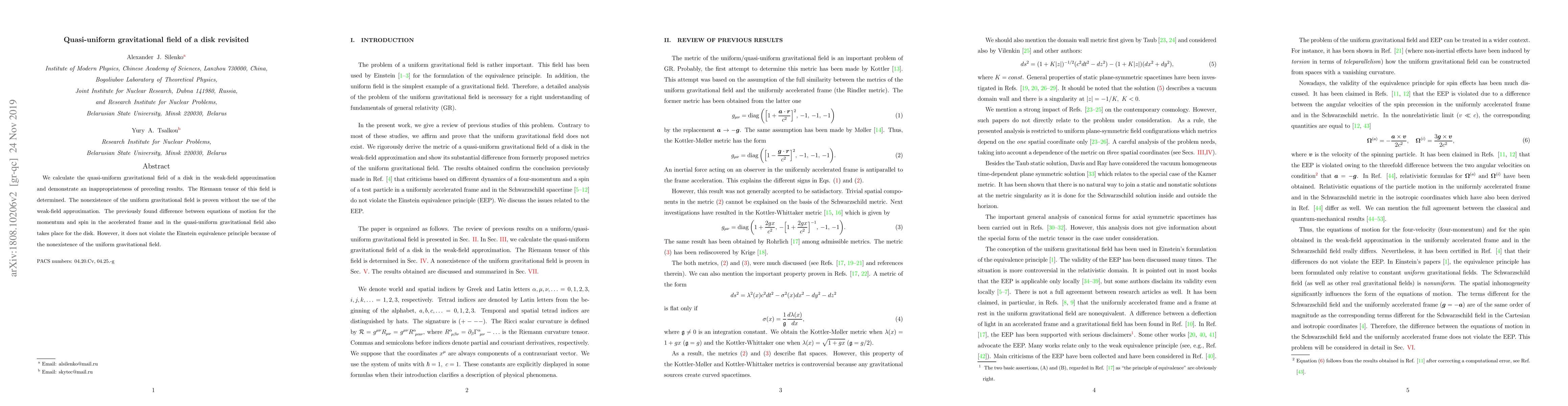 A study re-evaluates the quasi-uniform gravitational field of a disk, finding it does not exist in reality without using approximation. The results highlight the importance of considering the Einstein equivalence principle when analyzing gravitational fields.
