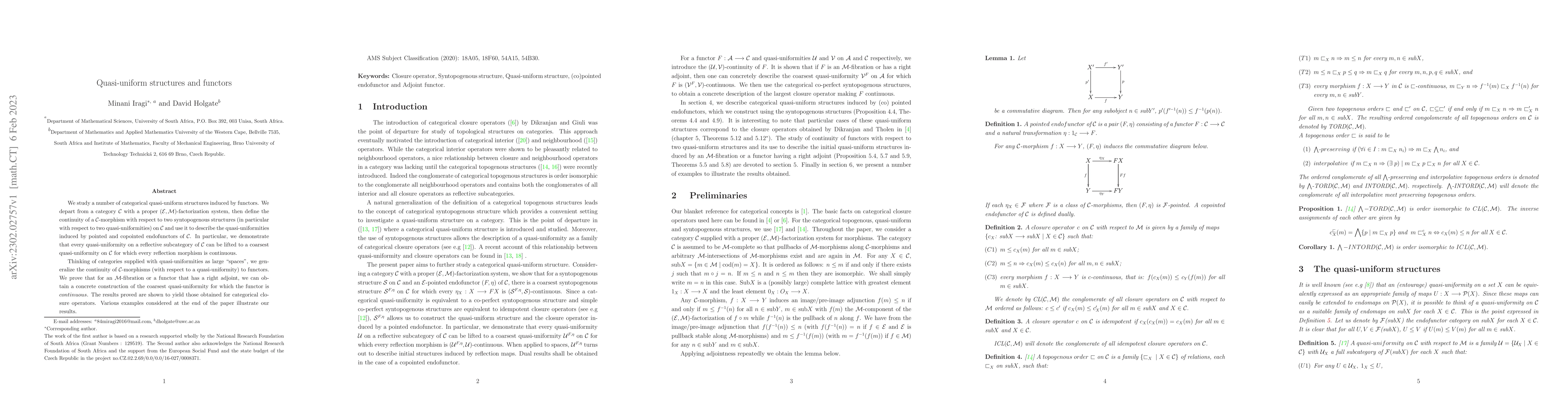 We study a number of categorical quasi-uniform structures induced by functors. We depart from a category $\mathcal{C}$ with a proper $(\mathcal{E}, \mathcal{M})$-factorization system, then define the continuity of a $\mathcal{C}$-morphism with respect to two syntopogenous structures (in particular with respect to two quasi-uniformities) on $\mathcal{C}$ and use it to describe the quasi-uniformities induced by pointed and copointed endofunctors of $\mathcal{C}$. In particular, we demonstrate that every quasi-uniformity on a reflective subcategory of $\mathcal{C}$ can be lifted to a coarsest quasi-uniformity on $\mathcal{C}$ for which every reflection morphism is continuous. Thinking of categories supplied with quasi-uniformities as large ``spaces'', we generalize the continuity of $\mathcal{C}$-morphisms (with respect to a quasi-uniformity) to functors. We prove that for an $\mathcal{M}$-fibration or a functor that has a right adjoint, we can obtain a concrete construction of the coarsest quasi-uniformity for which the functor is $continuous$. The results proved are shown to yield those obtained for categorical closure operators. Various examples considered at the end of the paper illustrate our results.