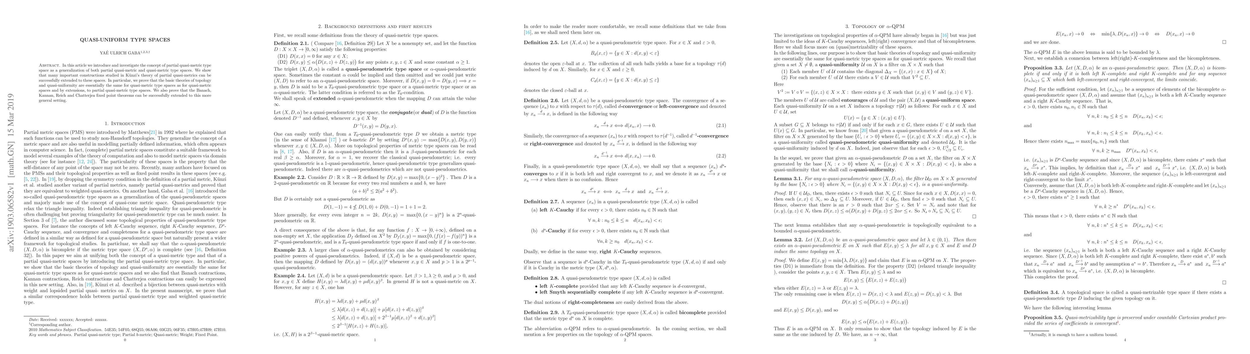 In this article, we introduce and investigate the concept of partial quasi-metric type space as a generalization of both partial quasi-metric and quasi-metric type spaces. We show that many important constructions studied in K\"unzi's theory of partial quasi-metrics can be successfully extended to these spaces. In particular, we prove that the basic theories of topology and quasi-uniformity are essentially the same for quasi-metric type spaces as for quasi-metric spaces and by extensions, to partial quasi-metric type spaces. We also prove that the Banach, Kannan, Reich and Chatterjea fixed point theorems can be successfully extended to this more general setting.