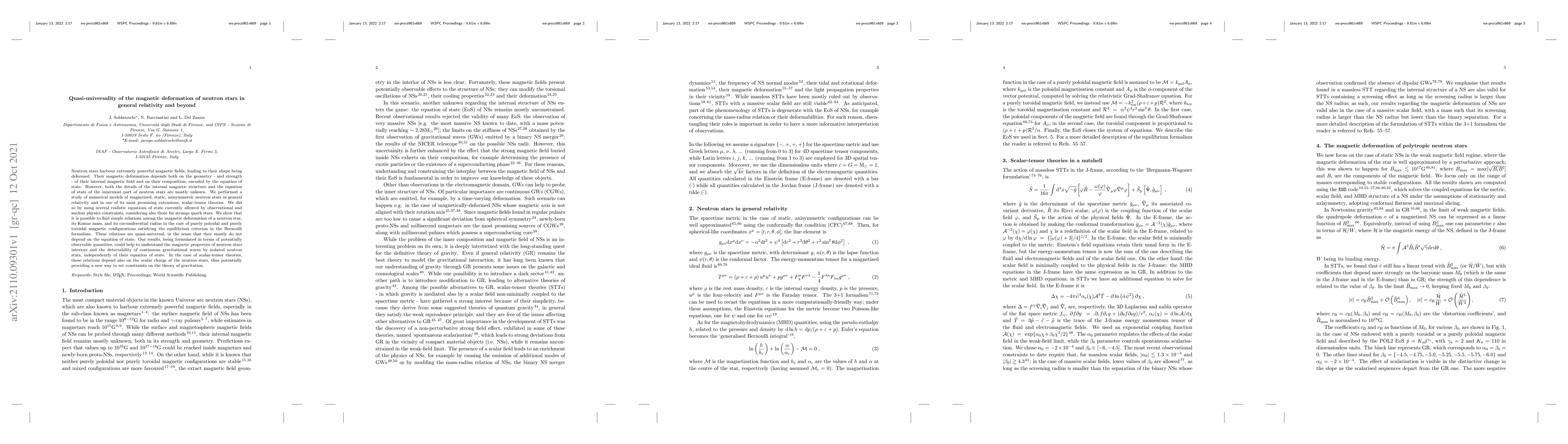 Neutron stars harbour extremely powerful magnetic fields, leading to their shape being deformed. Their magnetic deformation depends both on the geometry - and strength - of their internal magnetic field and on their composition, encoded by the equation of state. However, both the details of the internal magnetic structure and the equation of state of the innermost part of neutron stars are mostly unkown. We performed a study of numerical models of magnetised, static, axisymmetric neutron stars in general relativity and in one of its most promising extensions, scalar-tensor theories. We did so by using several realistic equations of state currently allowed by observational and nuclear physics constraints, considering also those for strange quark stars. We show that it is possible to find simple relations among the magnetic deformation of a neutron star, its Komar mass, and its circumferential radius in the case of purely poloidal and purely toroidal magnetic configurations satisfying the equilibrium criterion in the Bernoulli formalism. These relations are quasi-universal, in the sense that they mostly do not depend on the equation of state. Our results, being formulated in terms of potentially observable quantities, could help to understand the magnetic properties of neutron stars interiors and the detectability of continuous gravitational waves by isolated neutron stars, independently of their equation of state. In the case of scalar-tensor theories, these relations depend also on the scalar charge of the neutron stars, thus potentially providing a new way to set constraints on the theory of gravitation.