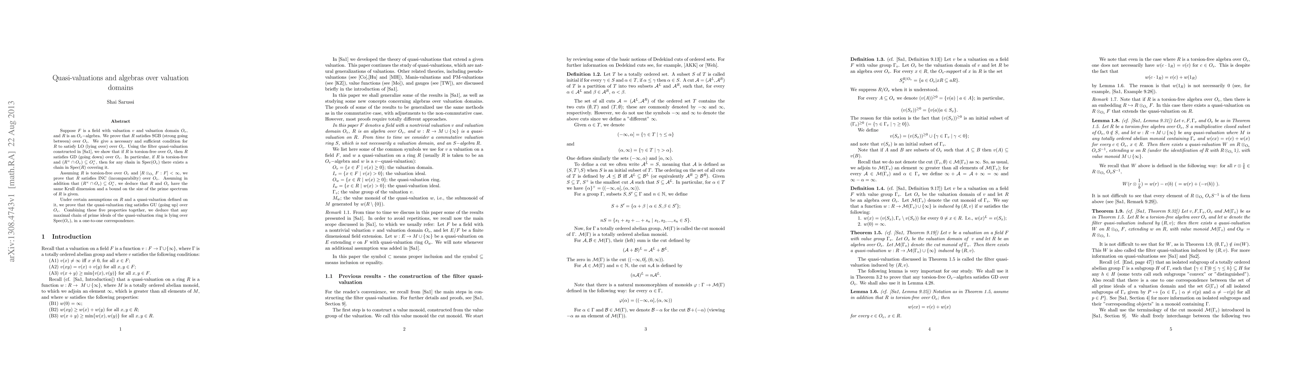 Suppose $F$ is a field with valuation $v$ and valuation domain $O_{v}$, and $R$ is an $O_{v}-$algebra. We prove that $R$ satisfies SGB (strong going between) over $O_{v}$. We give a necessary and sufficient condition for $R$ to satisfy LO (lying over) over $O_{v}$. Using the filter \qv constructed in [Sa1], we show that if $R$ is torsion-free over $O_{v}$ then $R$ satisfies GD (going down) over $O_{v}$. In particular, if $R$ is torsion-free and $(R^{\times} \cap O_{v}) \subseteq O_{v}^{\times}$, then for any chain in $\text{Spec}(O_v)$ there exists a chain in $\text{Spec}(R)$ covering it. Assuming $R$ is torsion-free over $O_{v}$ and $[R \otimes_{O_{v}}F:F]< \infty$, we prove that $R$ satisfies INC (incomparabilty) over $O_{v}$. Assuming in addition that $(R^{\times} \cap O_{v}) \subseteq O_{v}^{\times}$, we deduce that $R$ and $O_{v}$ have the same Krull dimension and a bound on the size of the prime spectrum of $R$ is given. Under certain assumptions on $R$ and a \qv defined on it, we prove that the \qv ring satisfies GU (going up) over $O_{v}$. Combining these five properties together, we deduce that any maximal chain of prime ideals of the \qv ring is lying over $\text{Spec}(O_{v})$, in a one-to-one correspondence.