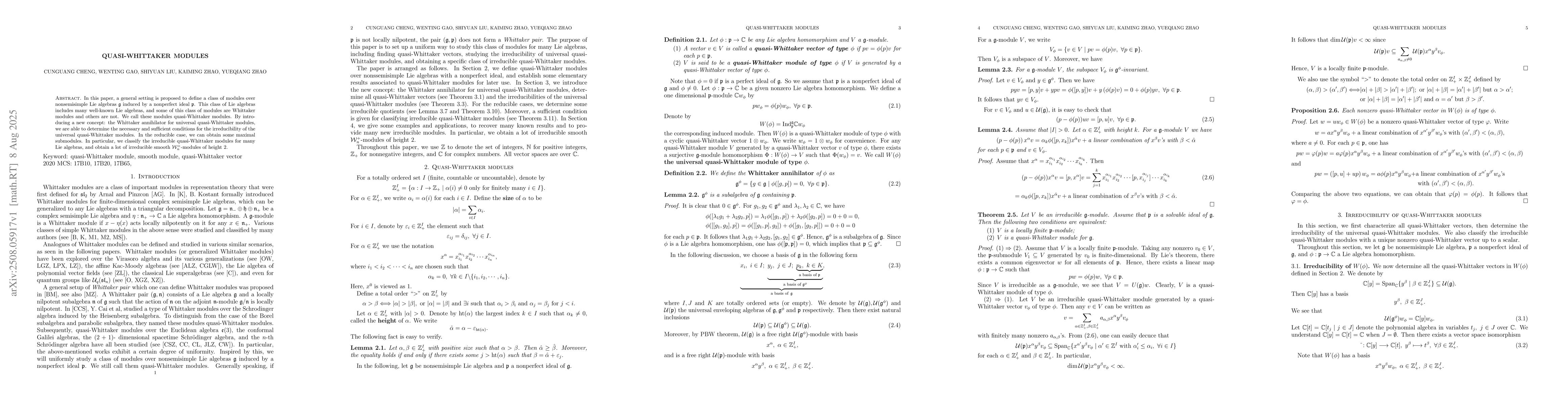 In this paper, a general setting is proposed to define a class of modules over nonsemisimple Lie algebras $\mathfrak{g}$ induced by a nonperfect ideal $\mathfrak{p}$. This class of Lie algebras includes many well-known Lie algebras, and some of this class of modules are Whittaker modules and others are not. We call these modules quasi-Whittaker modules. By introducing a new concept: the Whittaker annihilator for universal quasi-Whittaker modules, we are able to determine the necessary and sufficient conditions for the irreducibility of the universal quasi-Whittaker modules. In the reducible case, we can obtain some maximal submodules. In particular, we classify the irreducible quasi-Whittaker modules for many Lie algebras, and obtain a lot of irreducible smooth $\mathcal{W}_n^+$-modules of height $2$.