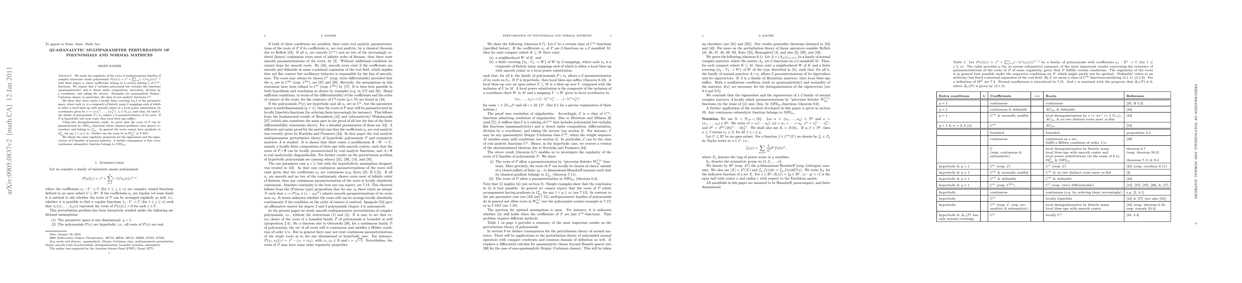 We study the regularity of the roots of multiparameter families of complex univariate monic polynomials $P(x)(z) = z^n + \sum_{j=1}^n (-1)^j a_j(x) z^{n-j}$ with fixed degree $n$ whose coefficients belong to a certain subring $\mathcal C$ of $C^\infty$-functions. We require that $\mathcal C$ includes polynomial but excludes flat functions (quasianalyticity) and is closed under composition, derivation, division by a coordinate, and taking the inverse. Examples are quasianalytic Denjoy--Carleman classes, in particular, the class of real analytic functions $C^\omega$. We show that there exists a locally finite covering $\{\pi_k\}$ of the parameter space, where each $\pi_k$ is a composite of finitely many $\mathcal C$-mappings each of which is either a local blow-up with smooth center or a local power substitution (in coordinates given by $x \mapsto (\pm x_1^{\gamma_1},...,\pm x_q^{\gamma_q})$, $\gamma_i \in \mathbb N_{>0}$), such that, for each $k$, the family of polynomials $P {\o}\pi_k$ admits a $\mathcal C$-parameterization of its roots. If $P$ is hyperbolic (all roots real), then local blow-ups suffice. Using this desingularization result, we prove that the roots of $P$ can be parameterized by $SBV_{loc}$-functions whose classical gradients exist almost everywhere and belong to $L^1_{loc}$. In general the roots cannot have gradients in $L^p_{loc}$ for any $1 < p \le \infty$. Neither can the roots be in $W_{loc}^{1,1}$ or $VMO$. We obtain the same regularity properties for the eigenvalues and the eigenvectors of $\mathcal C$-families of normal matrices. A further consequence is that every continuous subanalytic function belongs to $SBV_{loc}$.