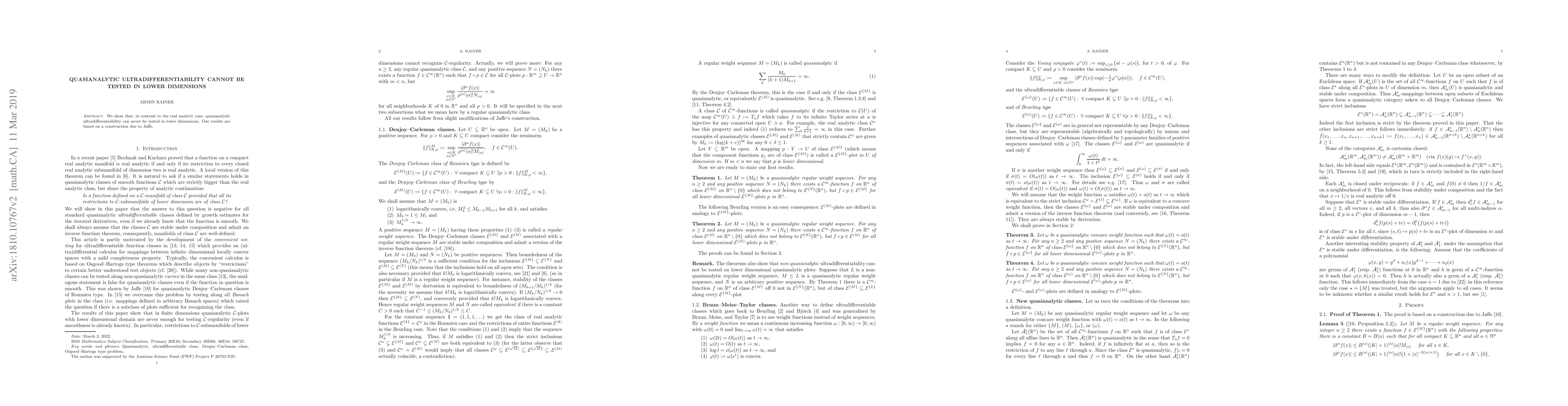 We show that, in contrast to the real analytic case, quasianalytic ultradifferentiability can never be tested in lower dimensions. Our results are based on a construction due to Jaffe.