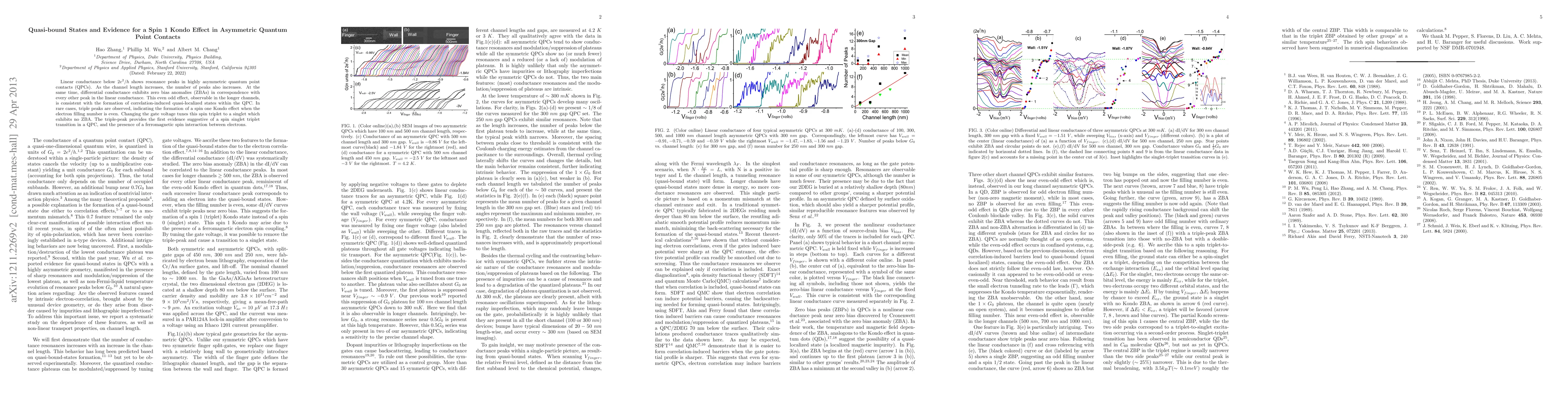 The paper presents evidence of quasibound states and a spin 1 Kondo effect in asymmetric quantum point contacts. Longer channels exhibit an even-odd effect in zero bias anomalies corresponding to every other peak in linear conductance, indicating quasi-localized states. Rare triple peaks suggest a spin one Kondo effect, providing the first evidence of a spin singlet-triplet transition and ferromagnetic spin interaction in QPCs.
