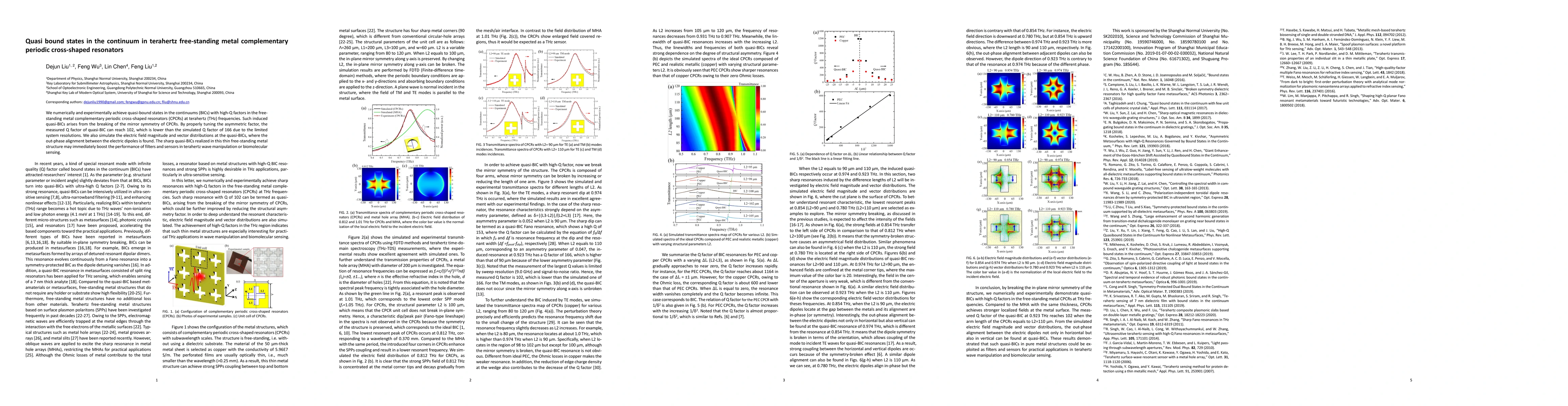 This paper reports on the achievement of quasi-bound states in the continuum (quasi-BICs) in free-standing metal complementary periodic cross-shaped resonators at terahertz frequencies, demonstrating high-Q factors through symmetry breaking. The study highlights the potential for enhanced performance in terahertz wave filters and sensors.