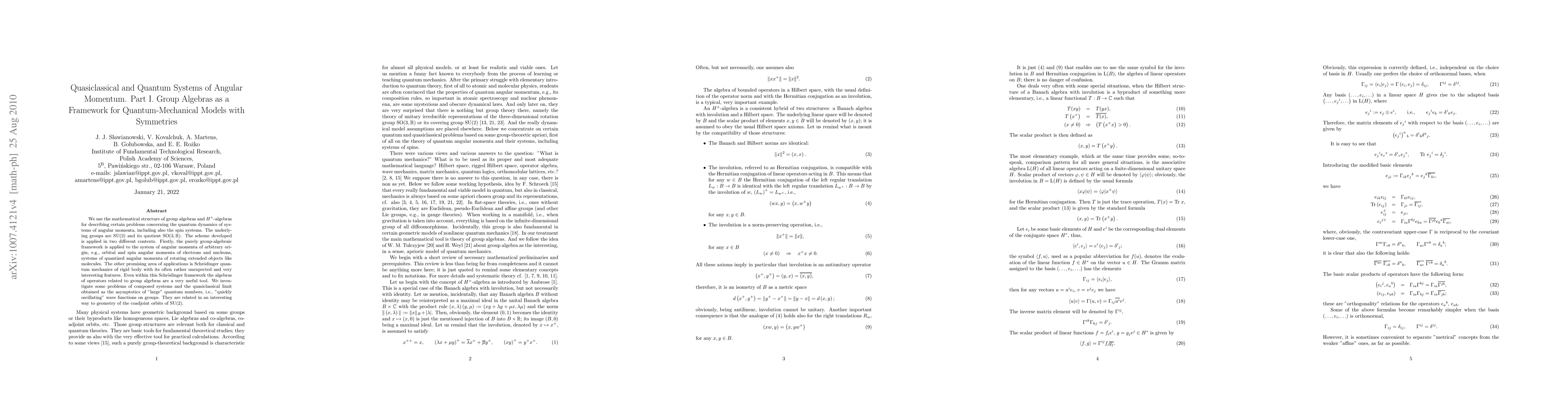 This paper introduces a framework using group algebras and $H^{+}$-algebras to model quantum systems of angular momentum, including spin systems. It applies this scheme to diverse contexts like electron/nucleon orbital angular momenta and quantum mechanics of rigid bodies, exploring composed systems and quasiclassical limits through large quantum numbers and coadjoint orbits of ${ m SU}(2)$.