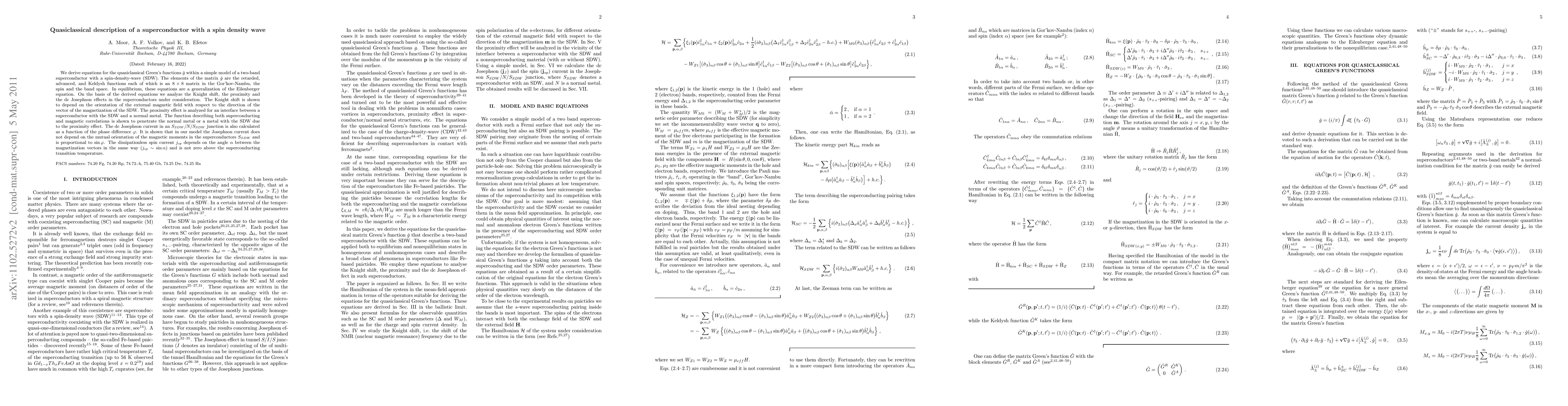We derive equations for the quasiclassical Green's functions $\check{g}$ within a simple model of a two-band superconductor with a spin-density-wave (SDW). The elements of the matrix $\check{g}$ are the retarded, advanced, and Keldysh functions each of which is an $8\times 8$ matrix in the Gor'kov-Nambu, the spin and the band space. In equilibrium, these equations are a generalization of the Eilenberger equation. On the basis of the derived equations we analyze the Knight shift, the proximity and the dc Josephson effects in the superconductors under consideration. The Knight shift is shown to depend on the orientation of the external magnetic field with respect to the direction of the vector of the magnetization of the SDW. The proximity effect is analyzed for an interface between a superconductor with the SDW and a normal metal. The function describing both superconducting and magnetic correlations is shown to penetrate the normal metal or a metal with the SDW due to the proximity effect. The dc Josephson current in an $S_{SDW}/N/S_{SDW}$ junction is also calculated as a function of the phase difference $\phi$. It is shown that in our model the Josephson current does not depend on the mutual orientation of the magnetic moments in the superconductors $S_{SDW}$ and is proportional to $ \sin \phi$. The dissipationless spin current $j_{sp}$ depends on the angle $\alpha $ between the magnetization vectors in the same way ($j_{sp} \sim \sin \alpha $) and is not zero above the superconducting transition temperature.