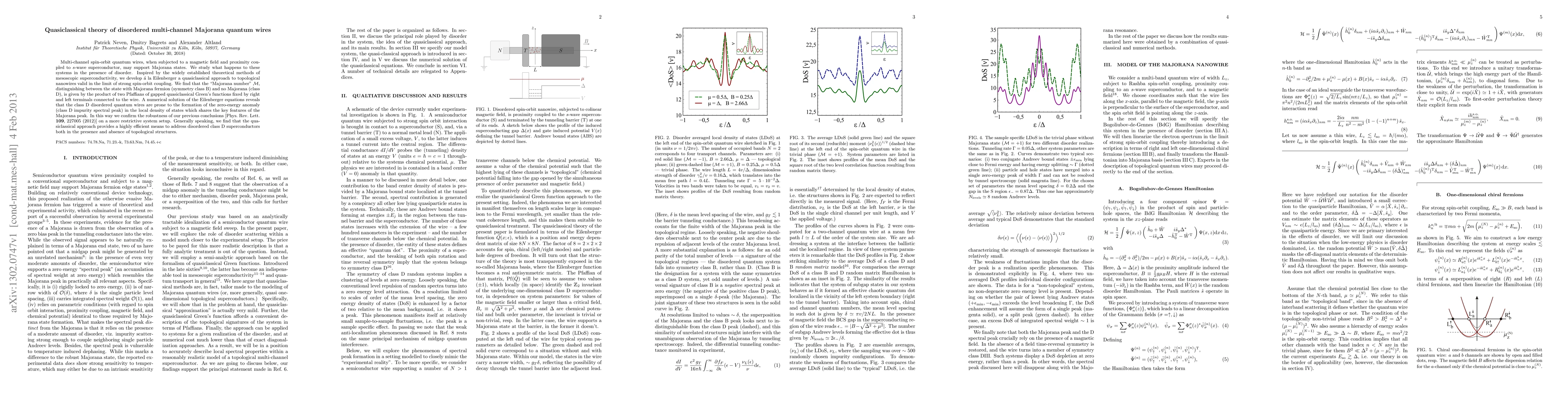 Multi-channel spin-orbit quantum wires, when subjected to a magnetic field and proximity coupled to s-wave superconductor, may support Majorana states. We study what happens to these systems in the presence of disorder. Inspired by the widely established theoretical methods of mesoscopic superconductivity, we develop a la Eilenberger a quasiclassical approach to topological nanowires valid in the limit of strong spin-orbit coupling. We find that the "Majorana number", distinguishing between the state with Majorana fermion (symmetry class B) and no Majorana (class D), is given by the product of two Pfaffians of gapped quasiclassical Green's functions fixed by right and left terminals connected to the wire. A numerical solution of the Eilenberger equations reveals that the class D disordered quantum wires are prone to the formation of the zero-energy anomaly (class D impurity spectral peak) in the local density of states which shares the key features of the Majorana peak. In this way we confirm the robustness of our previous conclusions [Phys. Rev. Lett. 109, 227005 (2012)] on a more restrictive system setup. Generally speaking, we find that the quasiclassical approach provides a highly efficient means to address disordered class D superconductors both in the presence and absence of topological structures.