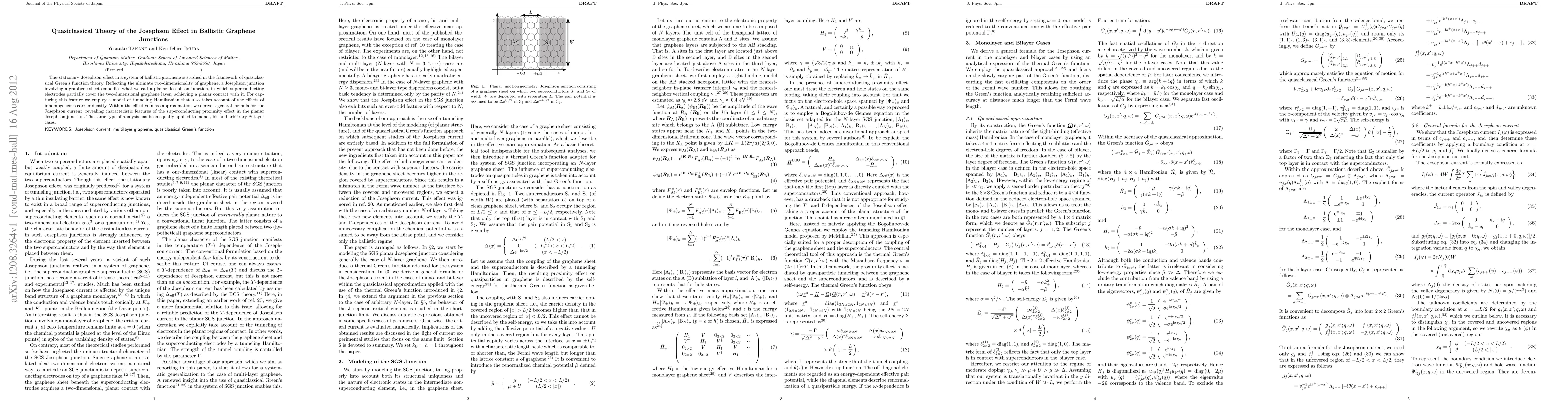 The stationary Josephson effect in a system of ballistic graphene is studied in the framework of quasiclassical Green's function theory. Reflecting the ultimate two-dimensionality of graphene, a Josephson junction involving a graphene sheet embodies what we call a planar Josephson junction, in which superconducting electrodes partially cover the two-dimensional graphene layer, achieving a planar contact with it. For capturing this feature we employ a model of tunneling Hamiltonian that also takes account of the effects of inhomogeneous carrier density. Within the effective mass approximation we derive a general formula for the Josephson current, revealing characteristic features of the superconducting proximity effect in the planar Josephson junction. The same type of analysis has been equally applied to mono-, bi- and arbitrary $N$-layer cases.