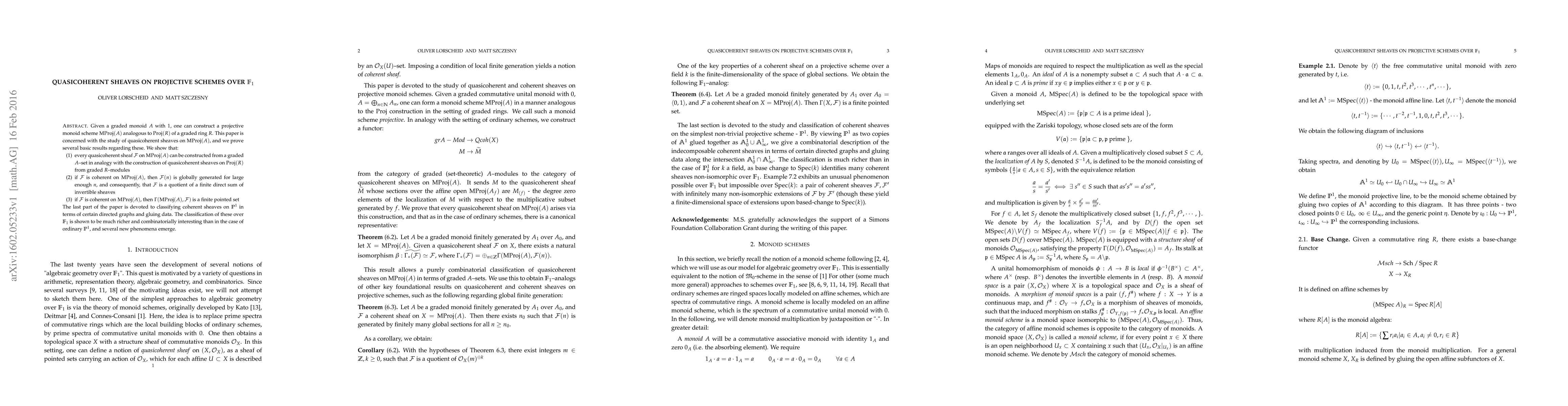 This paper studies quasicoherent sheaves on projective monoid schemes over a graded monoid, proving that they can be constructed from graded sets and that coherent sheaves have finite global sections. It also classifies coherent sheaves on P^1 over F_1 using directed graphs, revealing richer combinatorial structures compared to classical projective spaces.