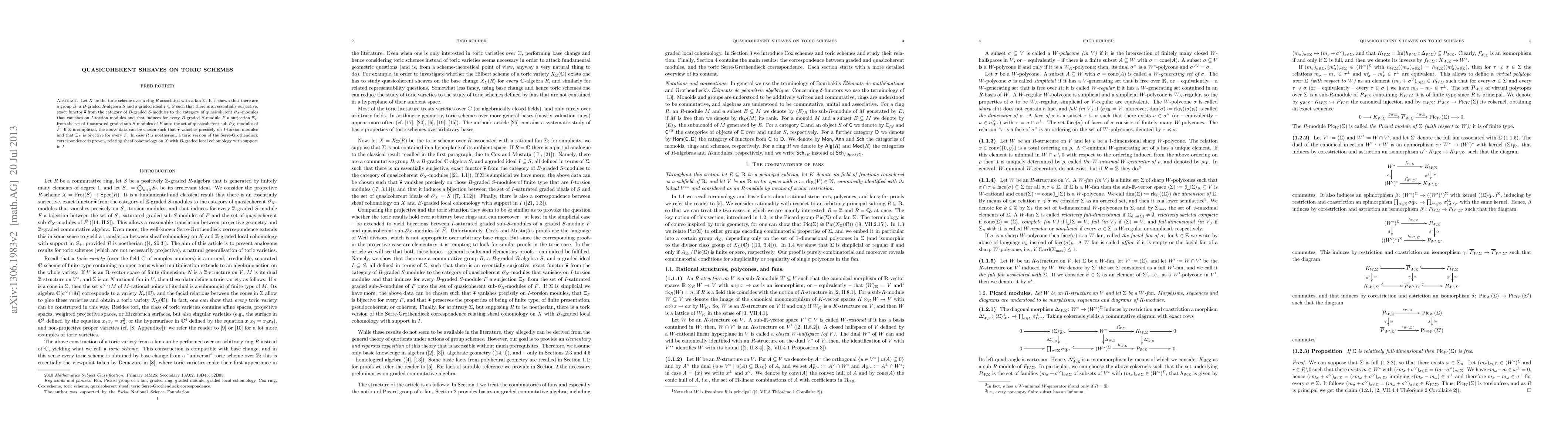 This paper explores quasicoherent sheaves on toric schemes, establishing a correspondence between B-graded S-modules and quasicoherent O_X-modules, with a focus on the case when the fan is simplicial. It also proves a toric version of the Serre-Grothendieck correspondence for noetherian rings.
