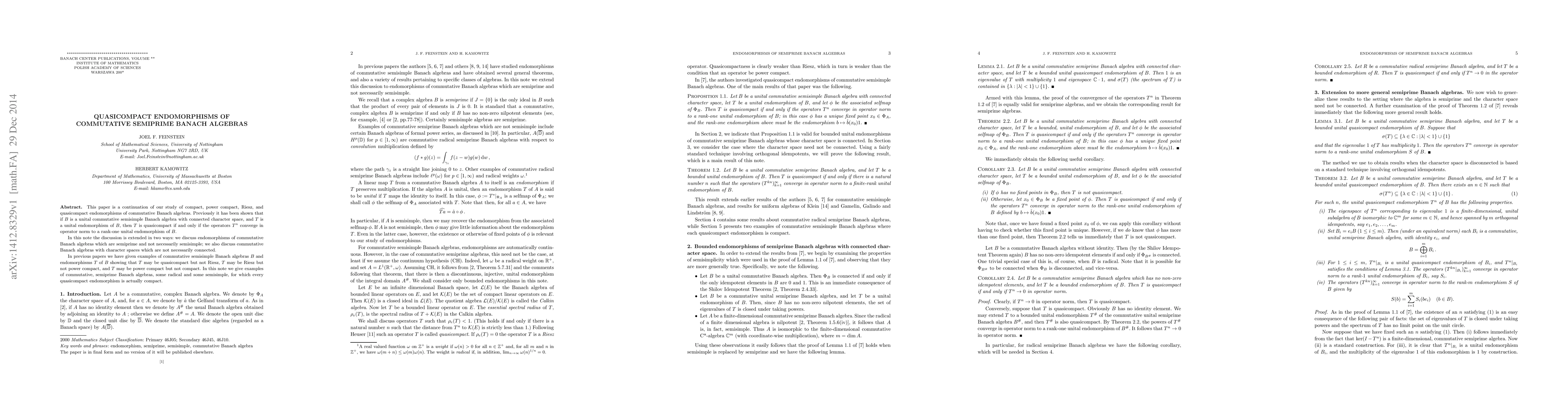 This paper extends the study of quasicompact endomorphisms in commutative Banach algebras, focusing on semiprime algebras that may not be semisimple and with character spaces that need not be connected. It provides examples of such algebras where every quasicompact endomorphism is compact.