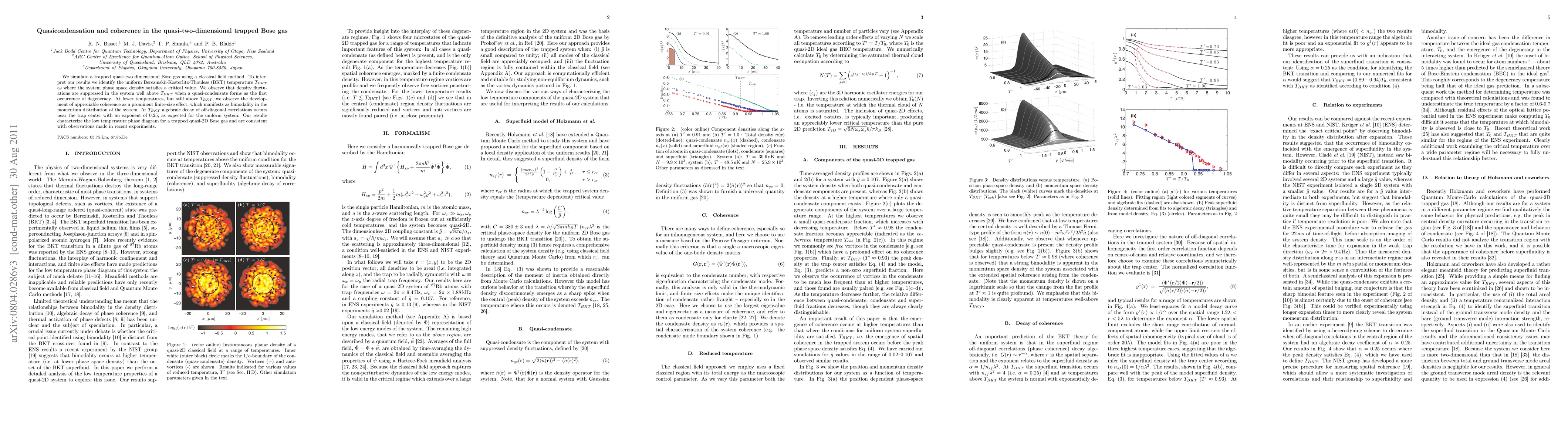 This paper investigates the quasicondensation and coherence in a trapped quasi-two-dimensional Bose gas using classical field simulations. It identifies the Berezinskii-Kosterlitz-Thouless temperature $T_{BKT}$ and observes the emergence of a quasi-condensate and coherence above $T_{BKT}$, with bimodality in the momentum distribution indicating coherence development.