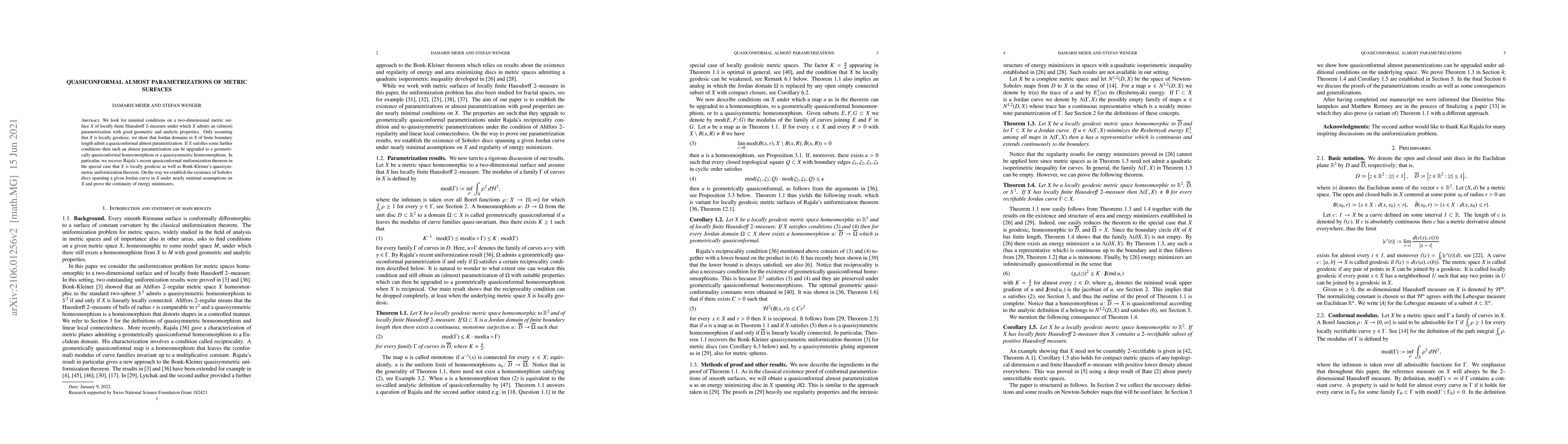 We look for minimal conditions on a two-dimensional metric surface $X$ of locally finite Hausdorff $2$-measure under which $X$ admits an (almost) parametrization with good geometric and analytic properties. Only assuming that $X$ is locally geodesic, we show that Jordan domains in $X$ of finite boundary length admit a quasiconformal almost parametrization. If $X$ satisfies some further conditions then such an almost parametrization can be upgraded to a geometrically quasiconformal homeomorphism or a quasisymmetric homeomorphism. In particular, we recover Rajala's recent quasiconformal uniformization theorem in the special case that $X$ is locally geodesic as well as Bonk-Kleiner's quasisymmetric uniformization theorem. On the way we establish the existence of Sobolev discs spanning a given Jordan curve in $X$ under nearly minimal assumptions on $X$ and prove the continuity of energy minimizers.