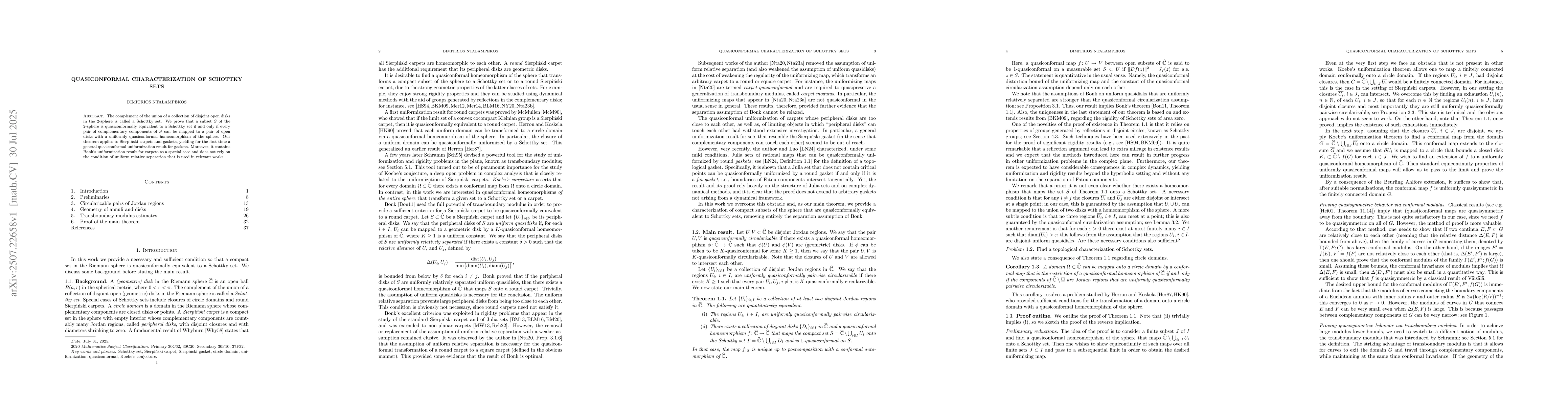 The paper introduces a novel quasiconformal characterization of Schottky sets, extending previous results by removing reliance on the uniform relative separation condition.