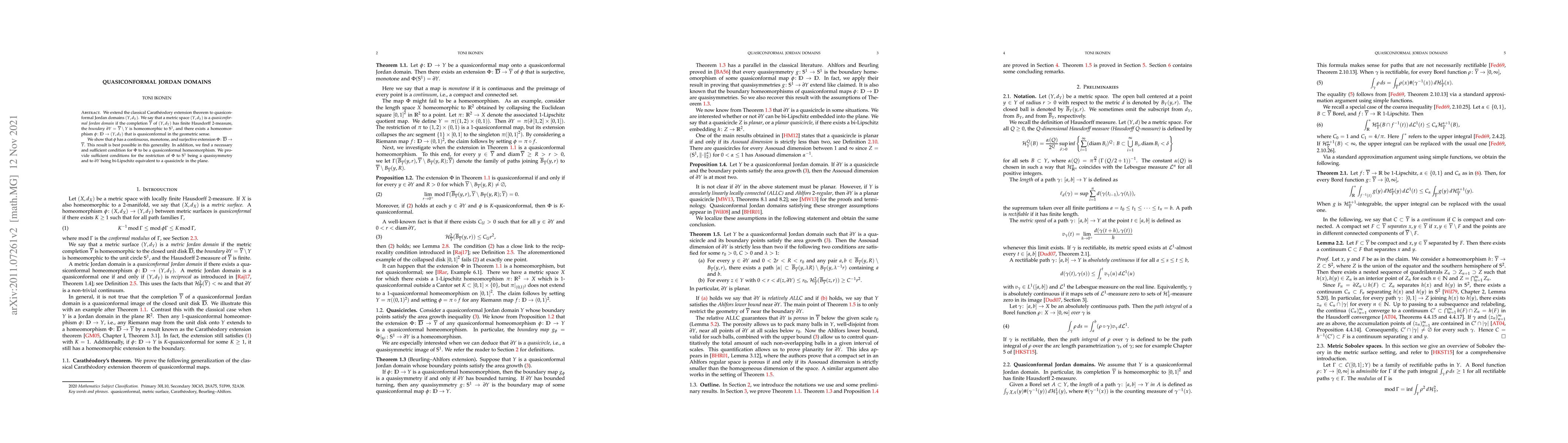 We extend the classical Carath\'eodory extension theorem to quasiconformal Jordan domains $( Y, d_{Y} )$. We say that a metric space $( Y, d_{Y} )$ is a quasiconformal Jordan domain if the completion $\overline{Y}$ of $( Y, d_{Y} )$ has finite Hausdorff $2$-measure, the boundary $\partial Y = \overline{Y} \setminus Y$ is homeomorphic to $\mathbb{S}^{1}$, and there exists a homeomorphism $\phi \colon \mathbb{D} \rightarrow ( Y, d_{Y} )$ that is quasiconformal in the geometric sense. We show that $\phi$ has a continuous, monotone, and surjective extension $\Phi \colon \overline{ \mathbb{D} } \rightarrow \overline{ Y }$. This result is best possible in this generality. In addition, we find a necessary and sufficient condition for $\Phi$ to be a quasiconformal homeomorphism. We provide sufficient conditions for the restriction of $\Phi$ to $\mathbb{S}^{1}$ being a quasisymmetry and to $\partial Y$ being bi-Lipschitz equivalent to a quasicircle in the plane.