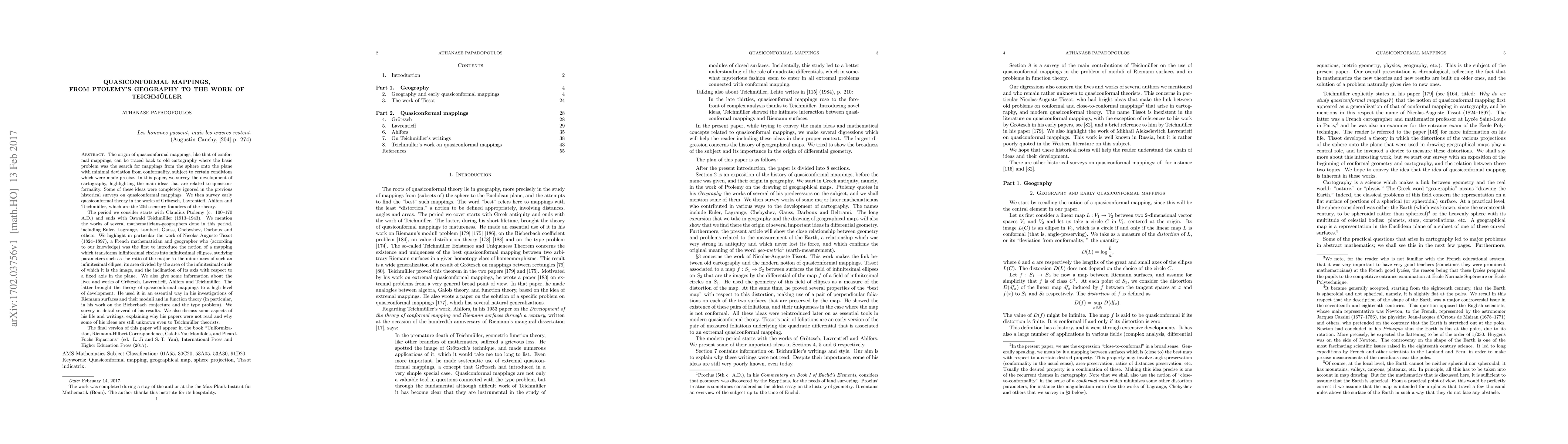 The origin of quasiconformal mappings, like that of conformal mappings, can be traced back to old cartography where the basic problem was the search for mappings from the sphere onto the plane with minimal deviation from conformality, subject to certain conditions which were made precise. In this paper, we survey the development of cartography, highlighting the main ideas that are related to quasiconformality. Some of these ideas were completely ignored in the previous historical surveys on quasiconformal mappings. We then survey early quasiconformal theory in the works of Gr\"otzsch, Lavrentieff, Ahlfors and Teichm\"uller, which are the 20th-century founders of the theory. The period we consider starts with Claudius Ptolemy (c. 100--170 A.D.) and ends with Oswald Teichm\"uller (1913--1943). We mention the works of several mathematicians-geographers done in this period, including Euler, Lagrange, Lambert, Gauss, Chebyshev, Darboux and others. We highlight in particular the work of Nicolas-Auguste Tissot (1824--1897), a French mathematician and geographer who (according to our knowledge) was the first to introduce the notion of a mapping which transforms infinitesimal circles into infinitesimal ellipses, studying parameters such as the ratio of the major to the minor axes of such an infinitesimal ellipse, its area divided by the area of the infinitesimal circle of which it is the image, and the inclination of its axis with respect to a fixed axis in the plane. We also give some information about the lives and works of Gr\"otzsch, Lavrentieff, Ahlfors and Teichm\"uller. The latter brought the theory of quasiconformal mappings to a high level of development. He used it in an essential way in his investigations of Riemann surfaces and their moduli and in function theory (in particular, in his work on the Bieberbach conjecture and the type problem). We survey in detail several of his results. We also discuss some aspects of his life and writings, explaining why his papers were not read and why some of his ideas are still unknown even to Teichm\"uller theorists. The final version of this paper will appear in the book "Uniformization, Riemann-Hilbert Correspondence, Calabi-Yau Manifolds, and Picard-Fuchs Equations" (ed. L. Ji and S.-T. Yau), International Press and Higher Education Press (2017).