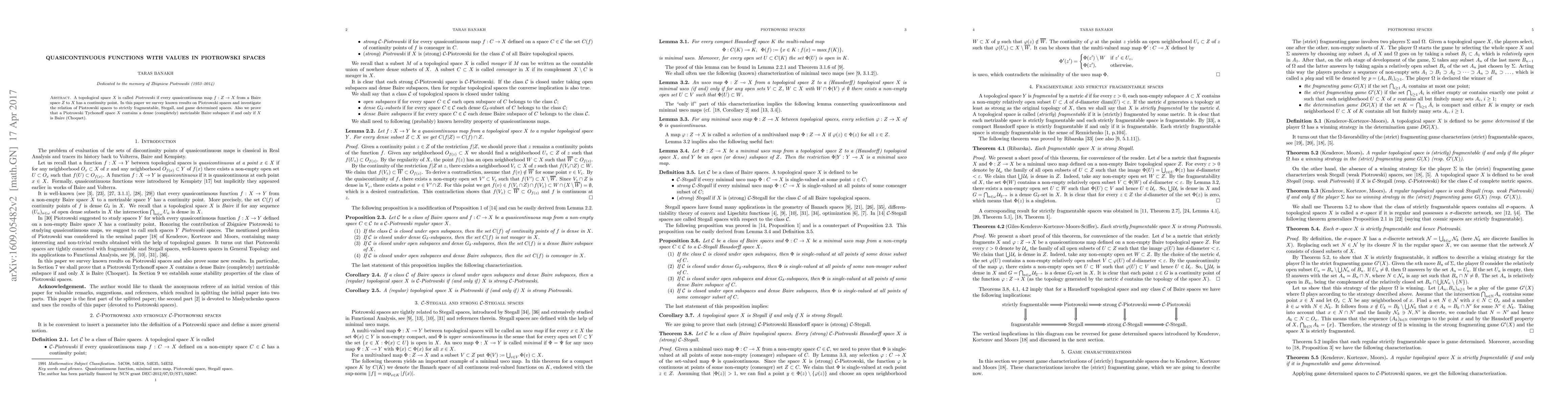 A topological space $X$ is called Piotrowski if every quasicontinuous map $f:Z\to X$ from a Baire space $Z$ to $X$ has a continuity point. In this paper we survey known results on Piotrowski spaces and investigate the relation of Piotrowski spaces to strictly fragmentable, Stegall, and game determined spaces. Also we prove that a Piotrowski Tychonoff space $X$ contains a dense (completely) metrizable Baire subspace if and only if $X$ is Baire (Choquet).