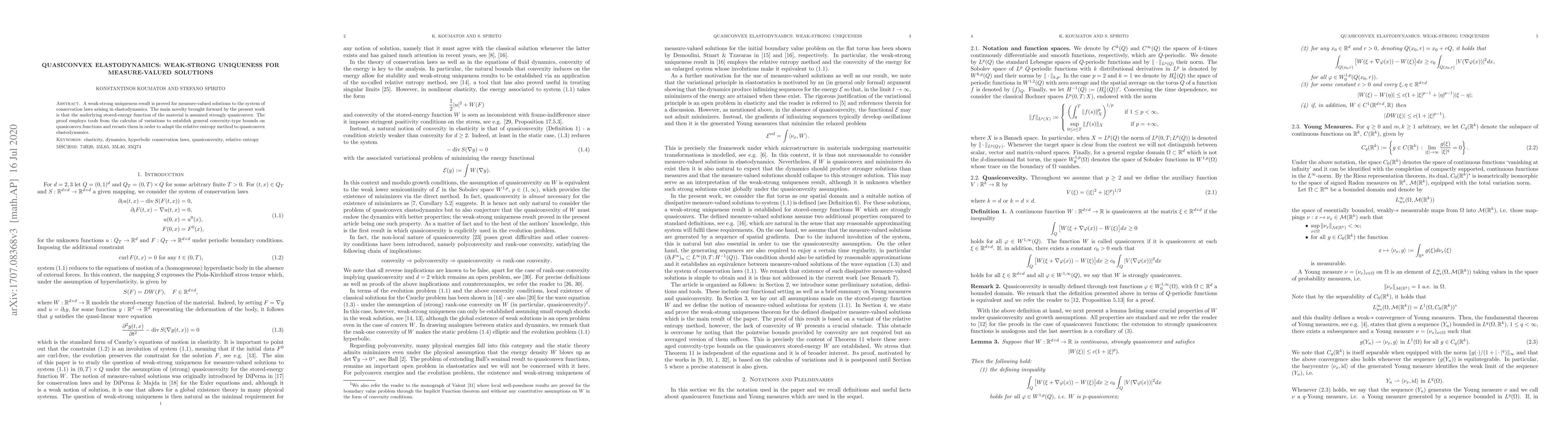 This paper proves weak-strong uniqueness for measure-valued solutions to elastodynamic conservation laws, assuming the material's stored-energy function is strongly quasiconvex. The proof leverages calculus of variations and adapts the relative entropy method to handle quasiconvex functions.