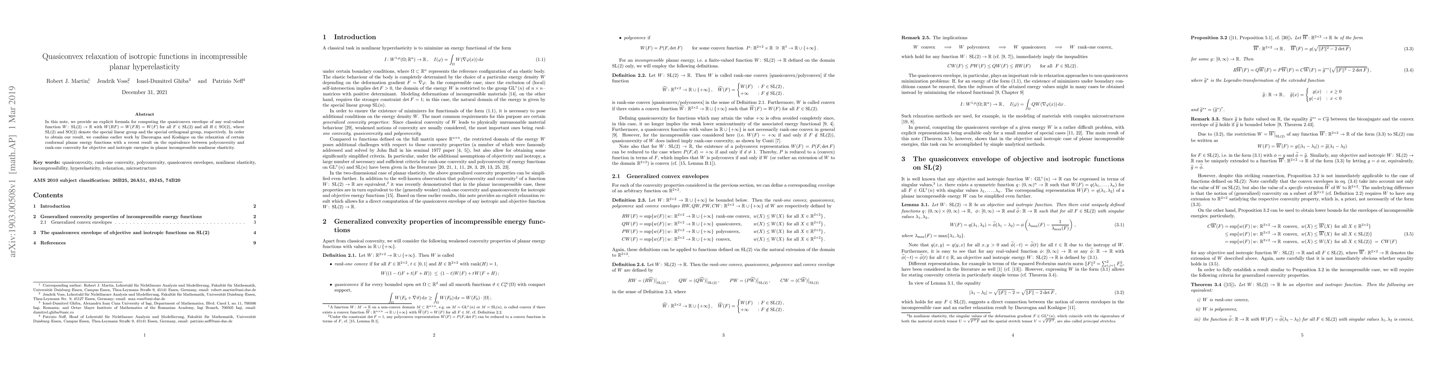 This paper provides an explicit formula for computing the quasiconvex envelope of isotropic functions in incompressible planar hyperelasticity, combining prior work on conformal planar energy functions with recent results on the equivalence between polyconvexity and rank-one convexity.