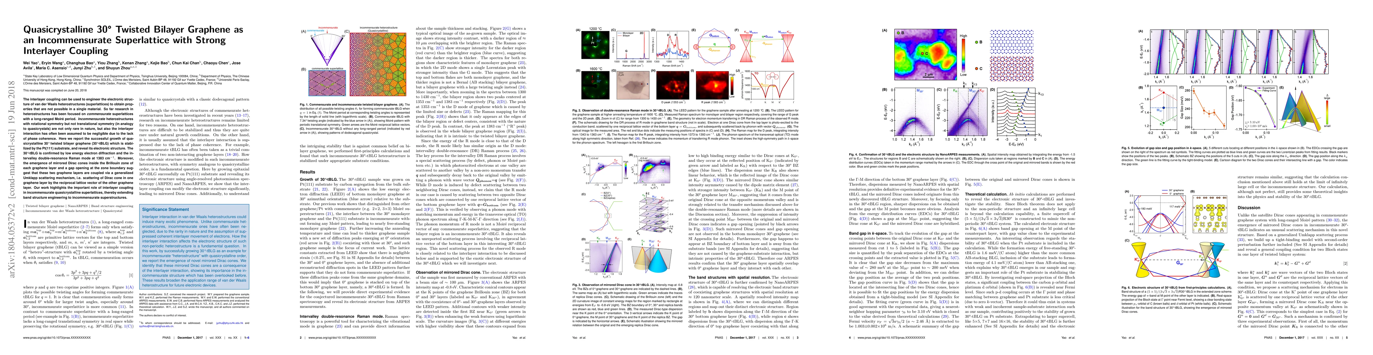 This study successfully grows quasicrystalline 30° twisted bilayer graphene (30°-tBLG) stabilized by a Pt(111) substrate, revealing significant interlayer coupling via a generalized Umklapp scattering mechanism. The research highlights the potential for band structure engineering in incommensurate superlattices, challenging prior assumptions about negligible interlayer interactions.