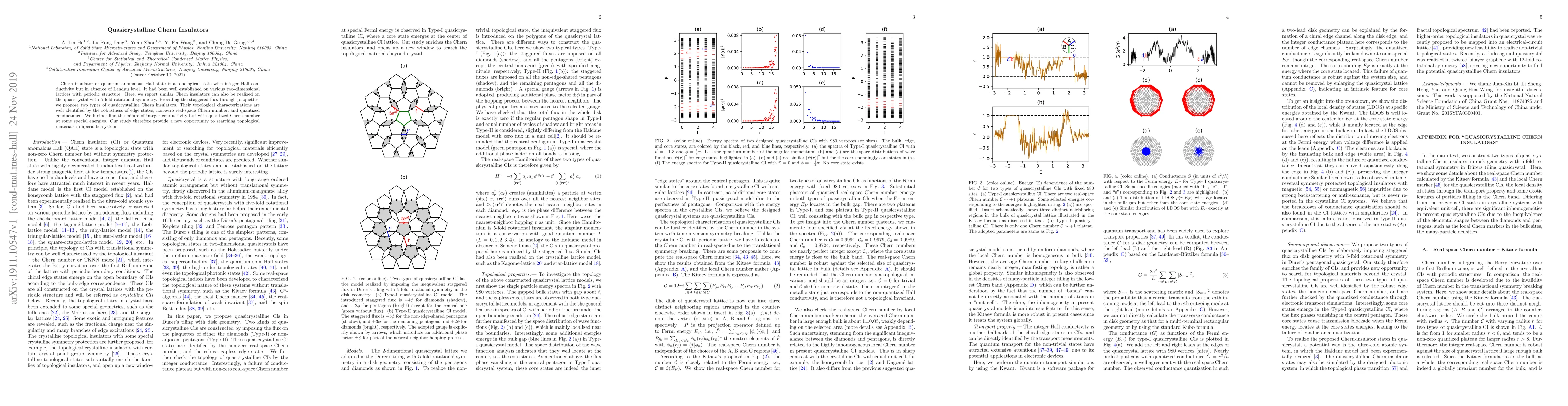 This research reports the realization of Chern insulators in quasicrystalline systems with 5-fold rotational symmetry, proposing two types with robust topological characteristics. The study identifies quantized conductance and non-zero real-space Chern number, highlighting a new avenue for topological material exploration in aperiodic systems.