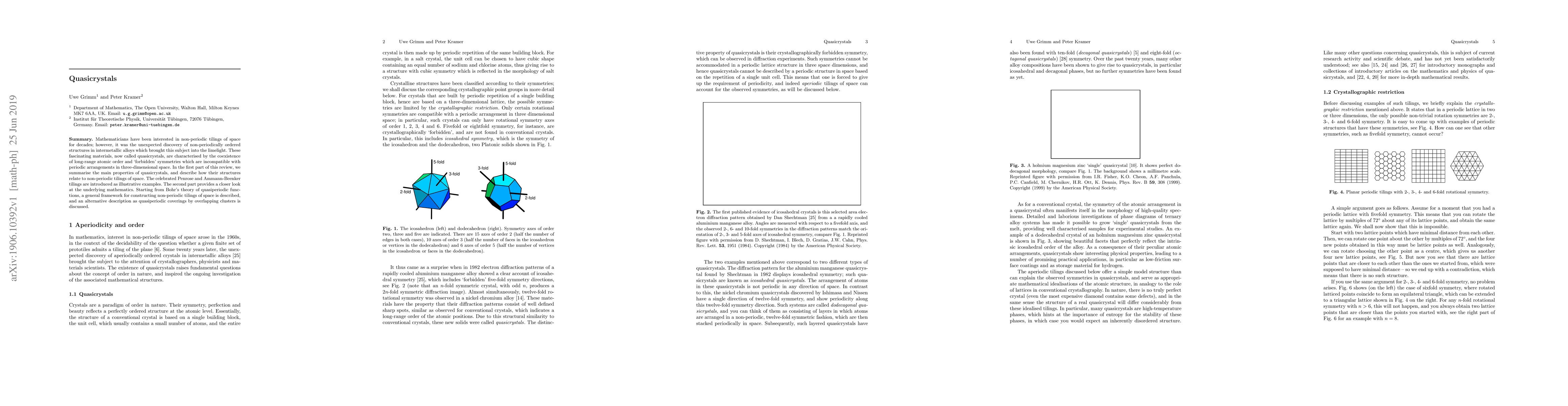 This paper reviews quasicrystals, materials exhibiting long-range atomic order with non-periodic symmetries, and their relation to non-periodic tilings like Penrose and Ammann-Beenker tilings. The paper also delves into the mathematical framework underpinning quasiperiodic functions and non-periodic tiling constructions.